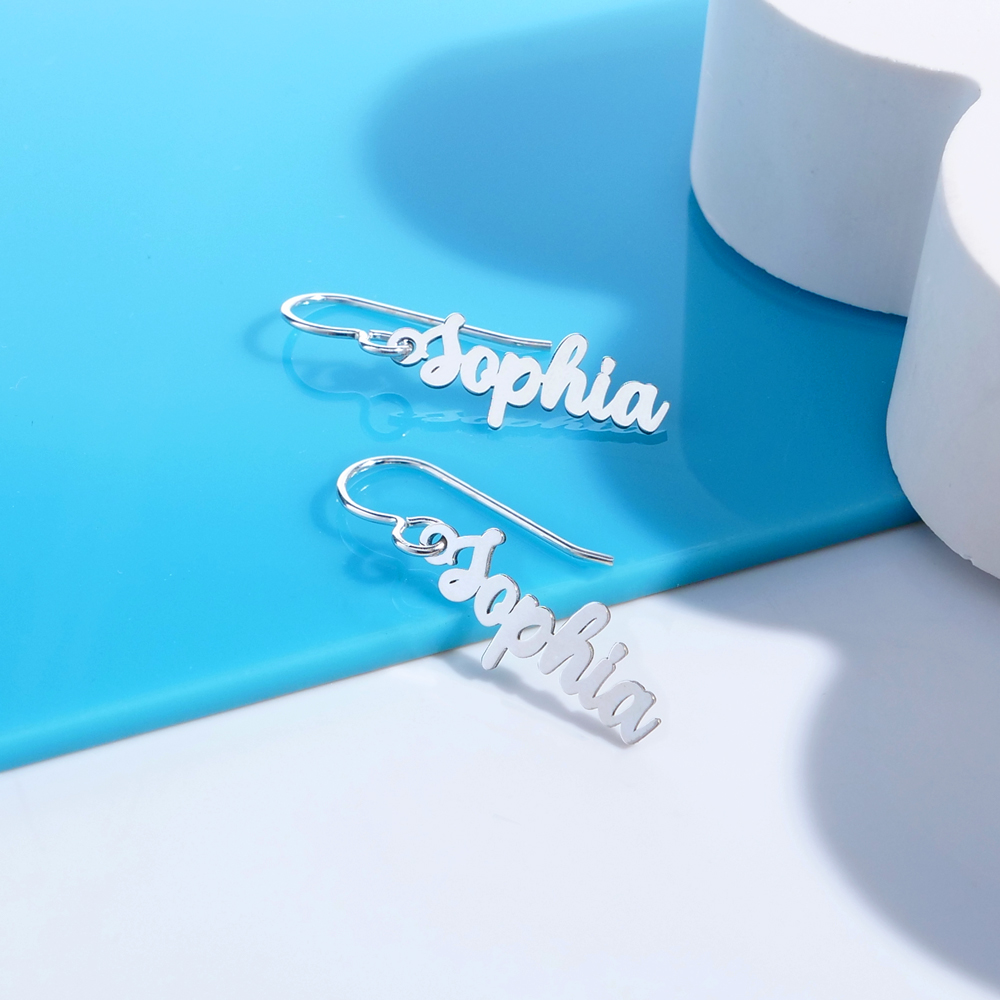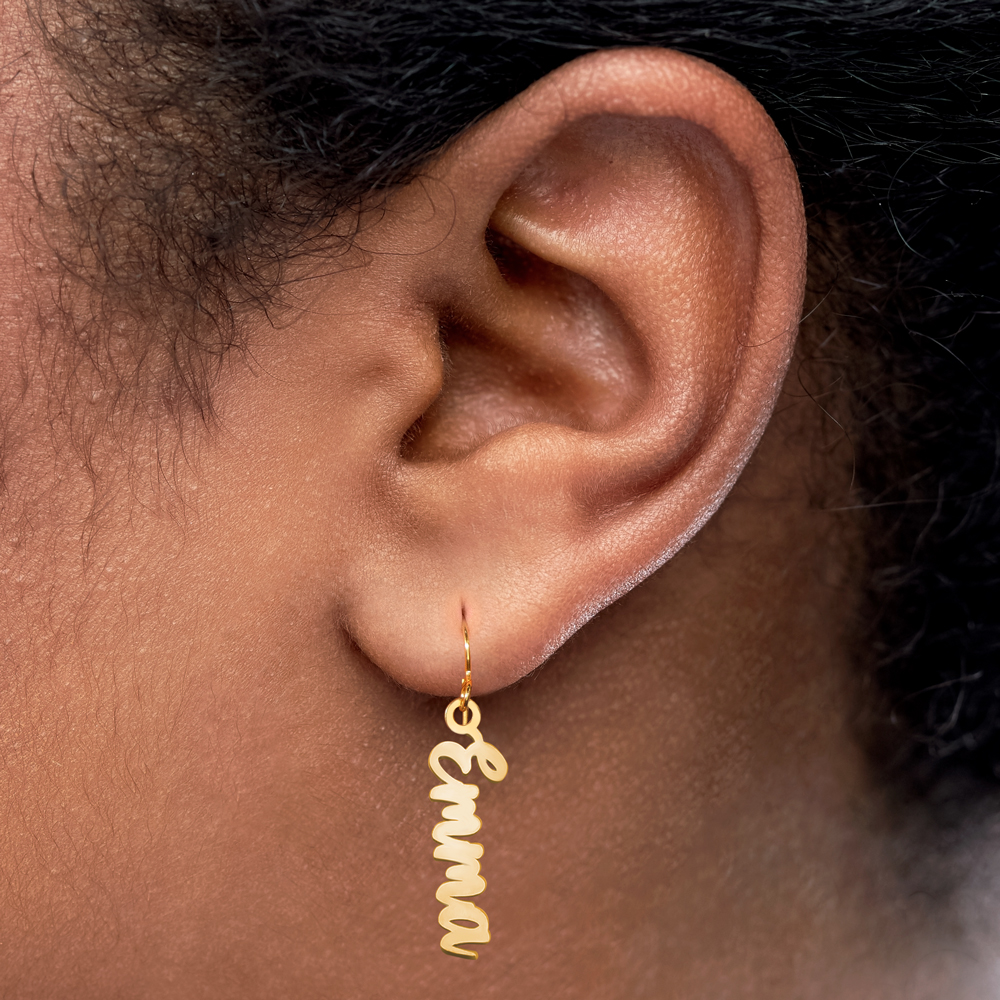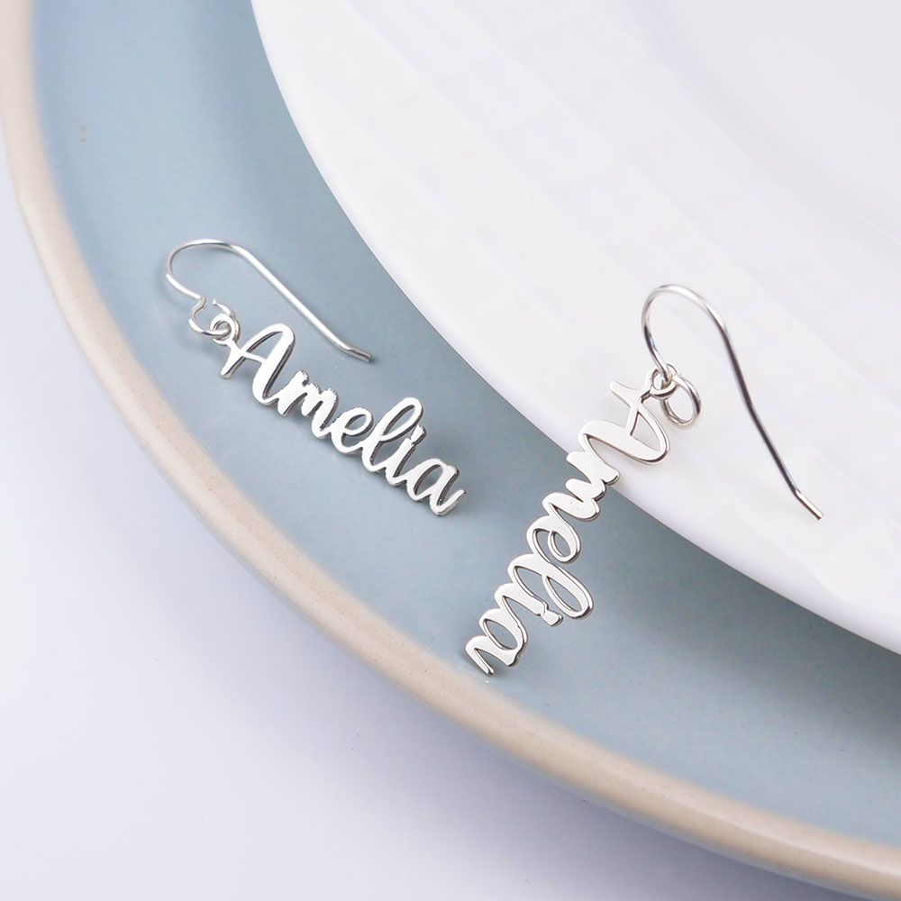 with a personal touch, these earrings come with your name inscribed in a stylish script. Each dangle earring is made to