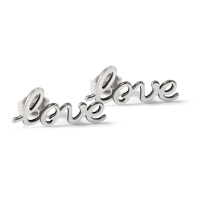 This pair of high polished script "Love" earrings is available in Solid .925 Sterling