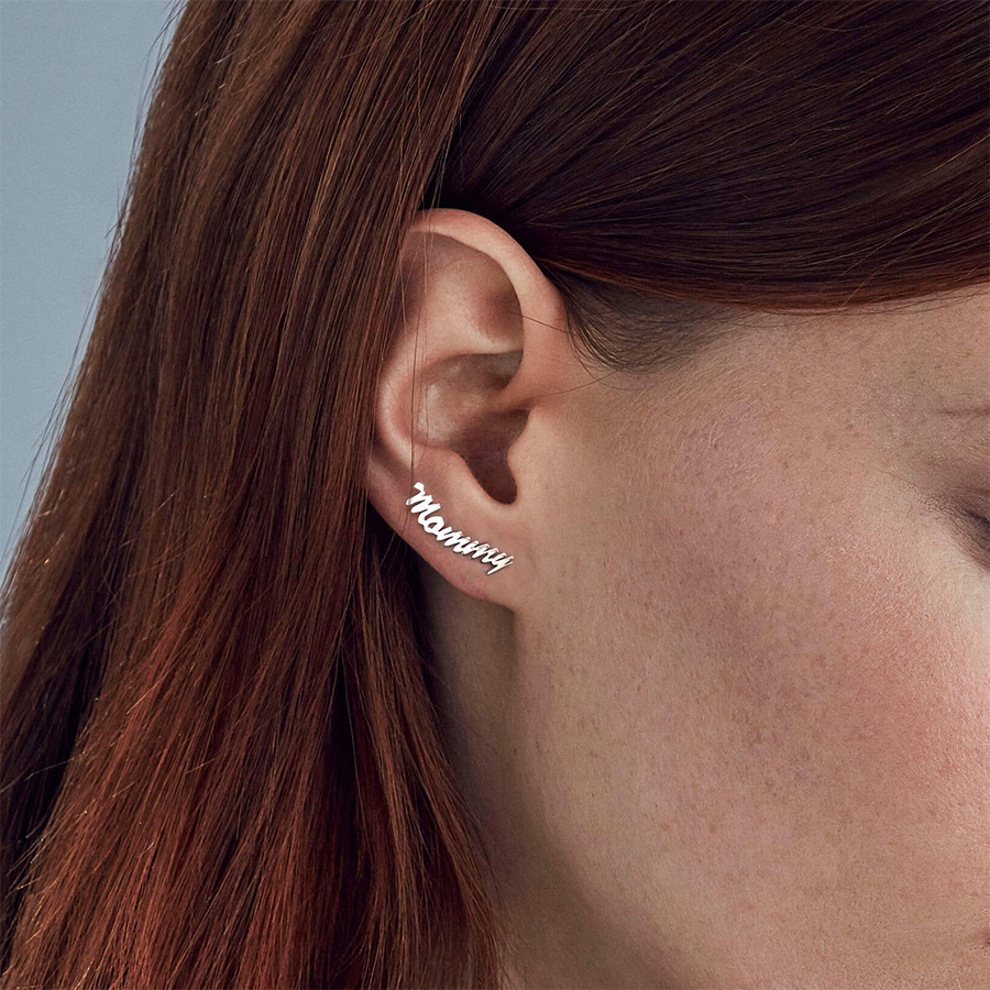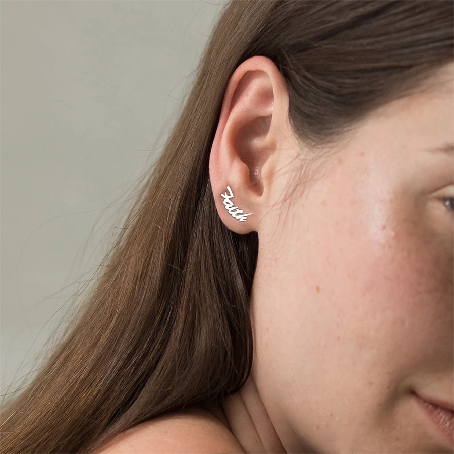 This pair of high polished script earrings is available in Solid .925 Sterling Silver, Black Sterling Silver, Gold Plated, Rose Gold Plated or Solid 14k Gold. Each earring measures 18mm in width which is 3/4 inches wide. They are made to fit perfectly on a female or child's ear