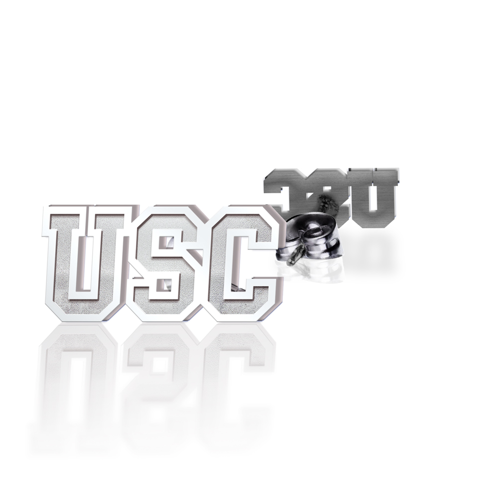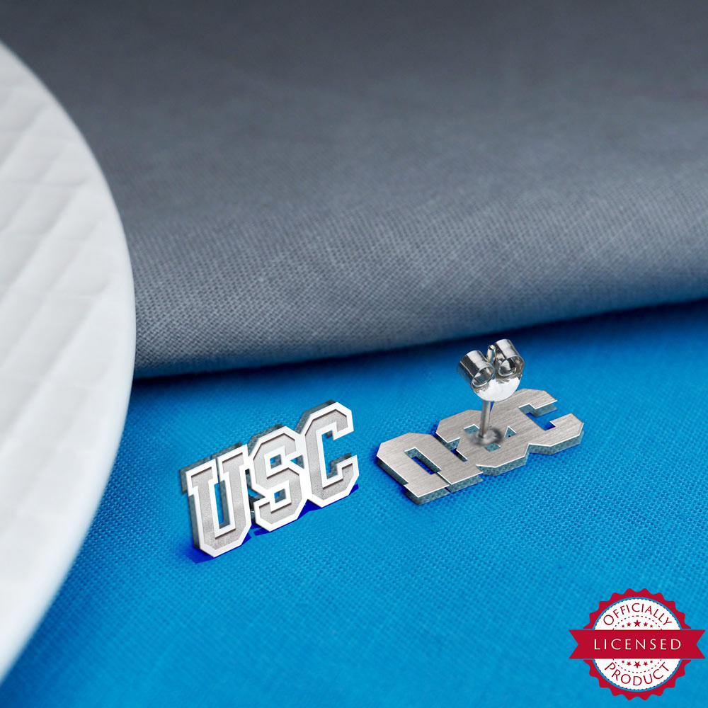 This pair of University of Southern California earrings is available in Stainless Steel, Solid .925 Sterling Silver, Black Sterling Silver, Gold Plated, Rose Gold Plated or Solid 14k Gold. Each earring measures 18mm in width which is 3/4 inches wide. They are made to fit perfectly on a female or child's ear.