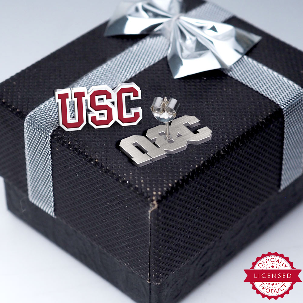 This pair of University of Southern California earrings is available in Stainless Steel, Solid .925 Sterling Silver, Black Sterling Silver, Gold Plated, Rose Gold Plated or Solid 14k Gold. Each earring measures 18mm in width which is 3/4 inches wide. They are made to fit perfectly on a female or child's ear.