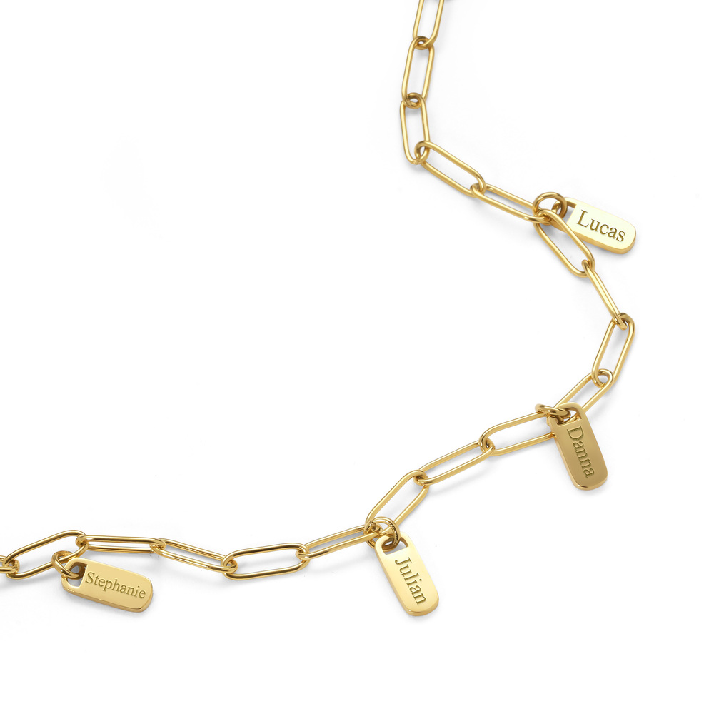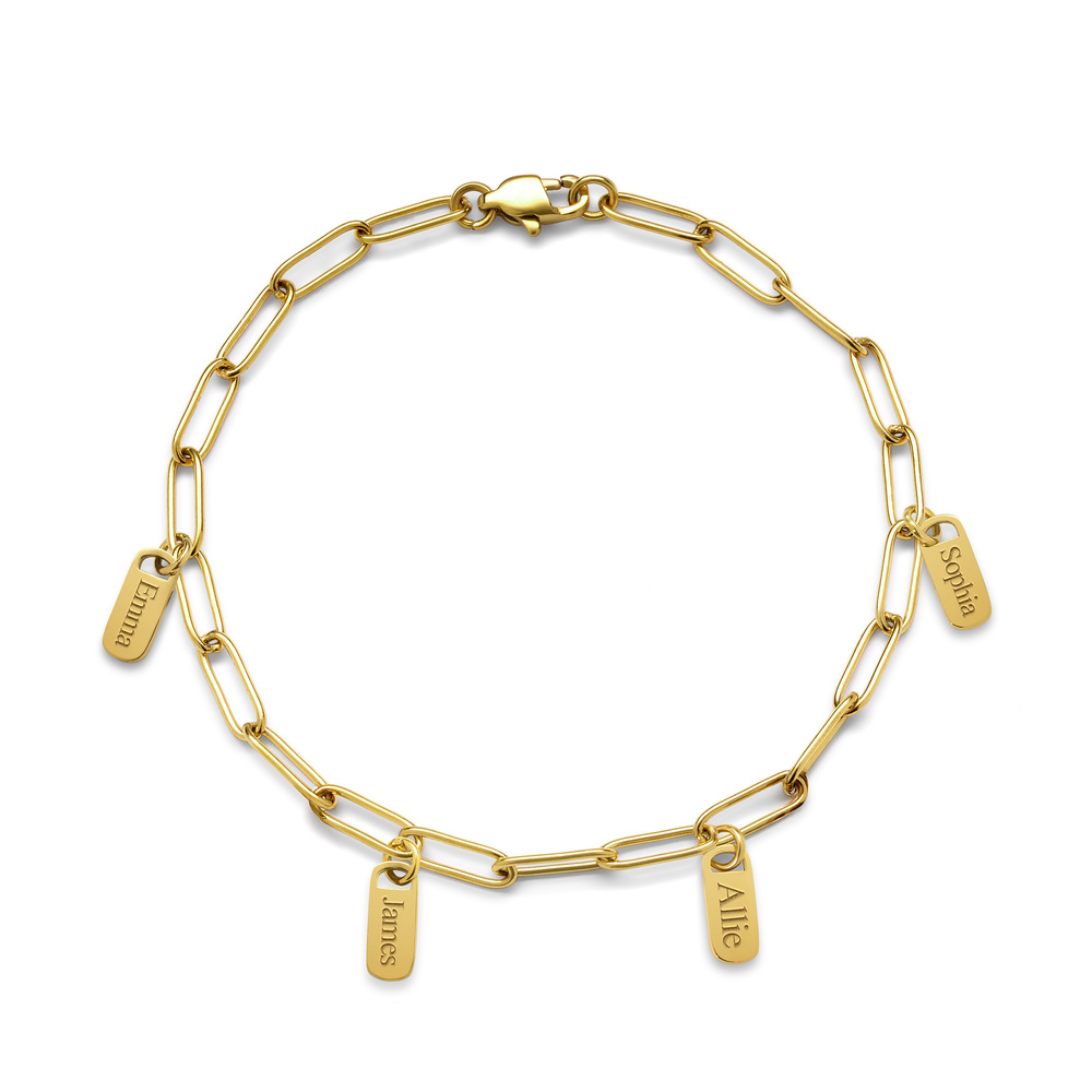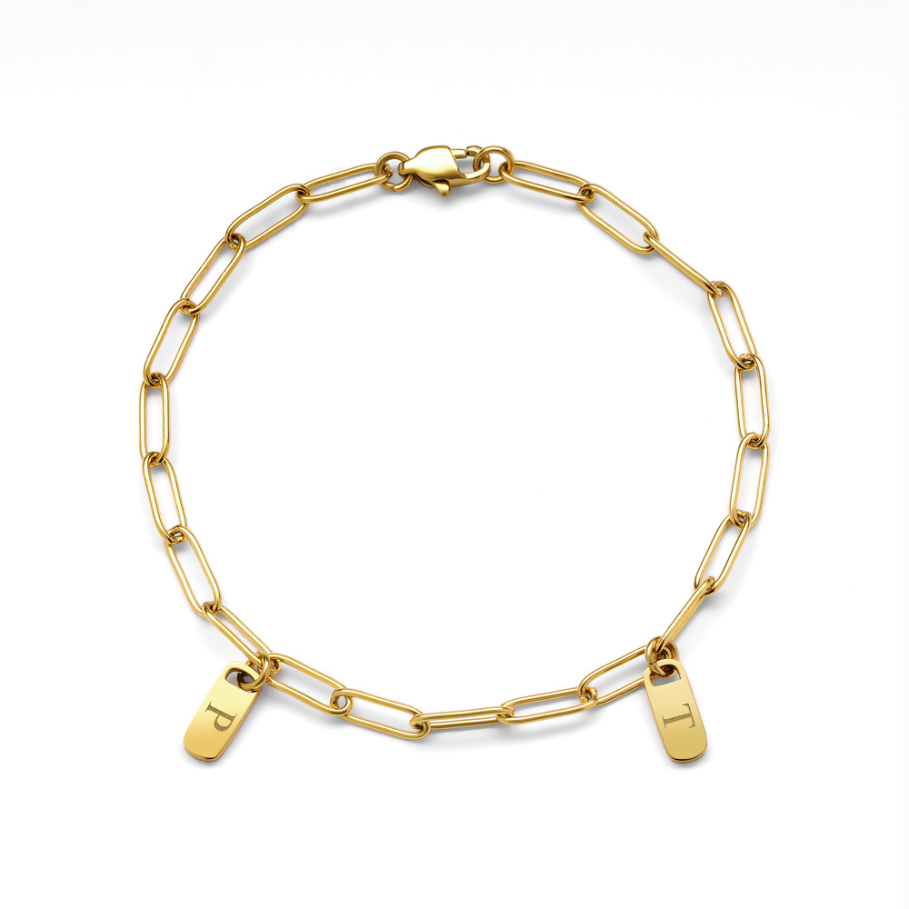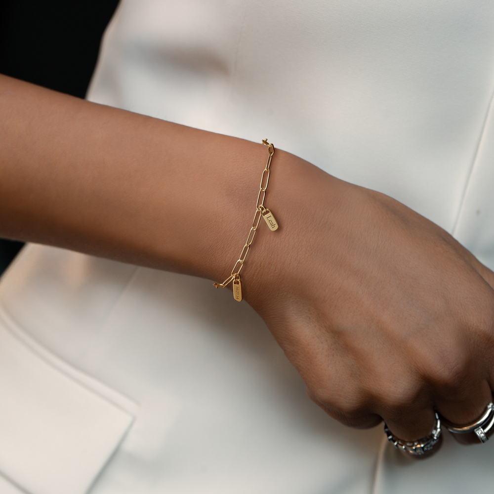 elongated links and multiple customizable tag charms, this bracelet is the perfect blend of modern minimalism and