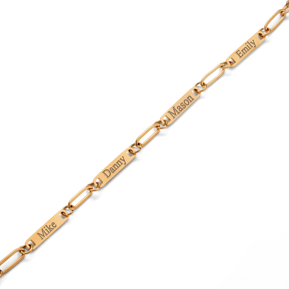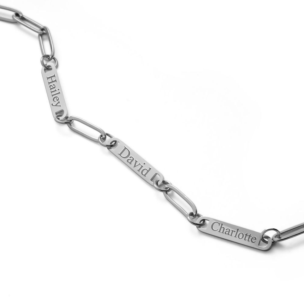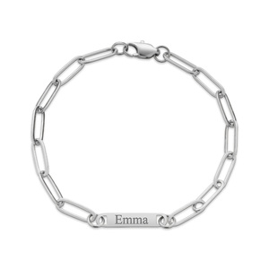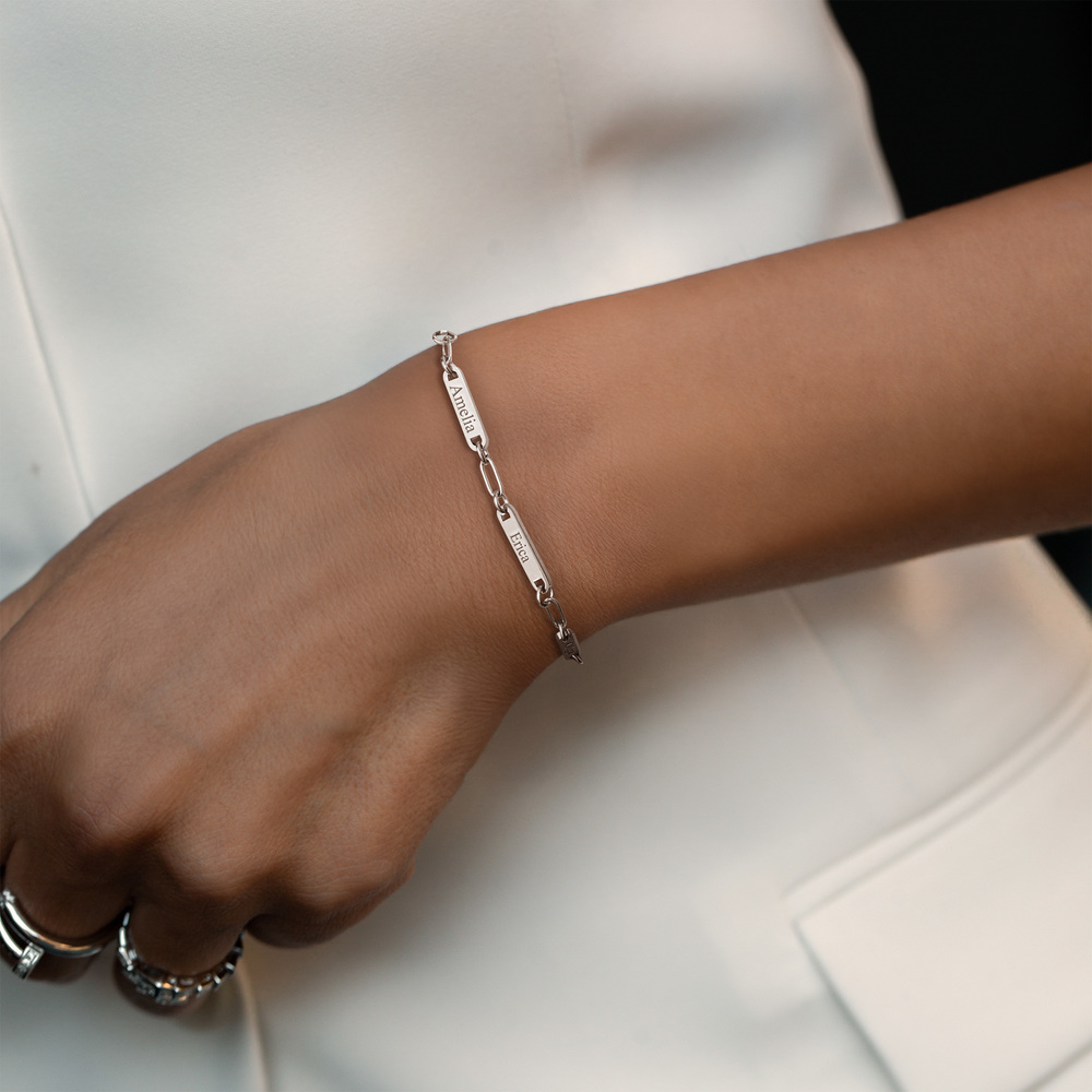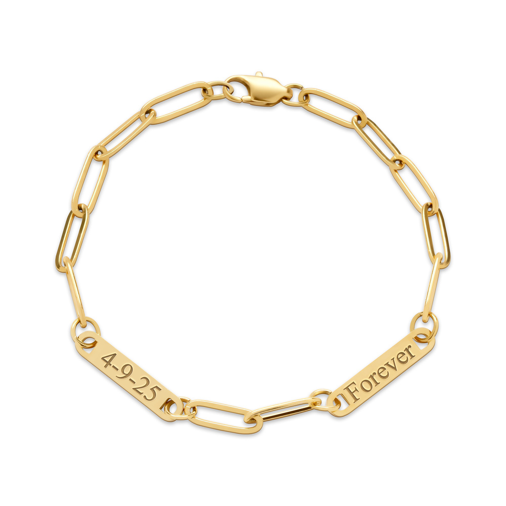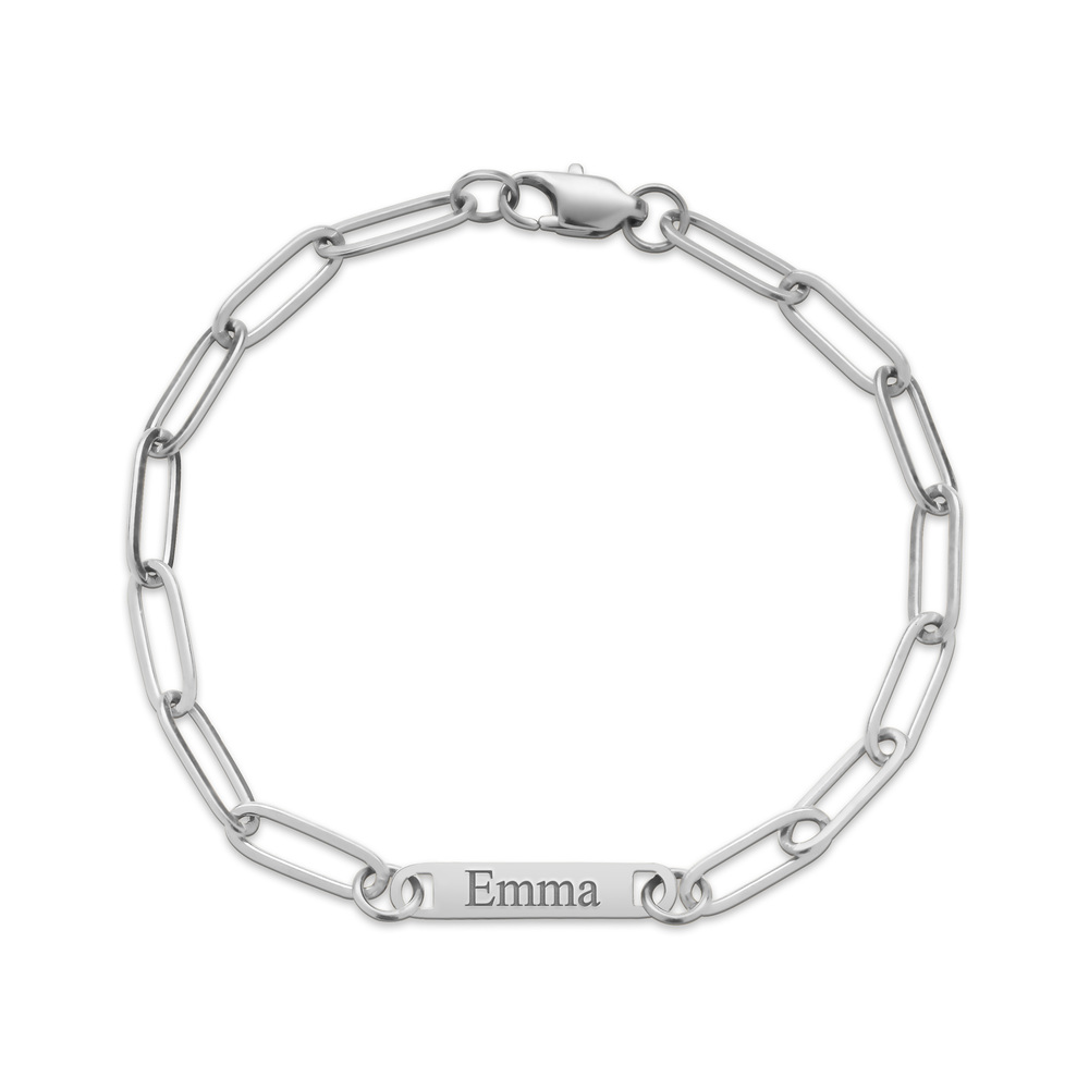 Showcase your style with this trendy paperclip-inspired name bracelet, available in gold-plated or sterling silver 925. The sleek bar pendant can be customized with any name, word, or special date (up to 12 characters), making it the perfect everyday keepsake.