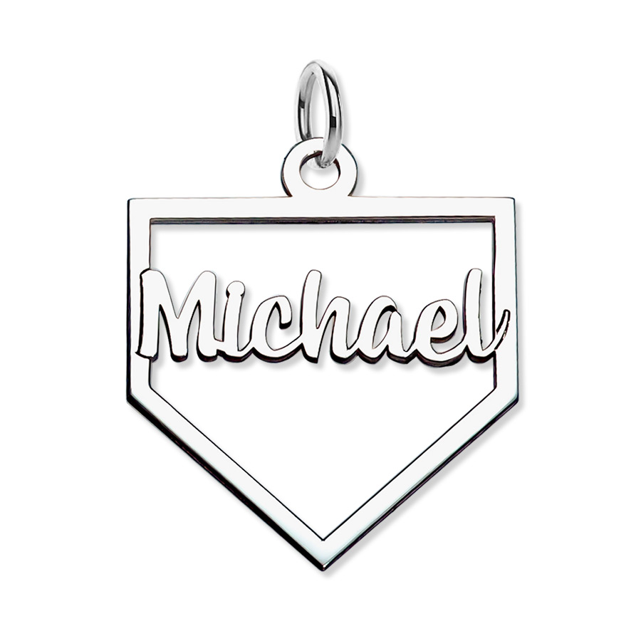Your Personalized Cut-out Baseball Homeplate Pendant w/ Name is available in 3/4 x 3/4 sizes and in Sterling Silver or