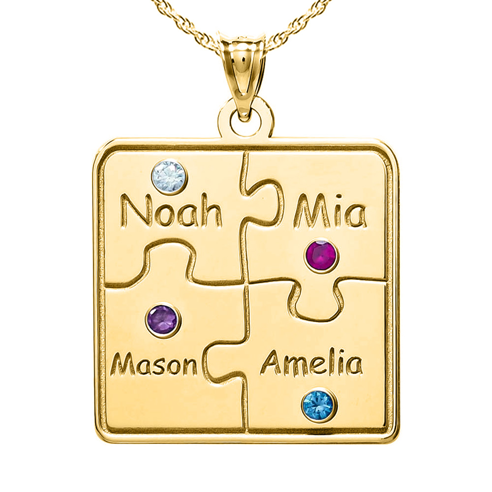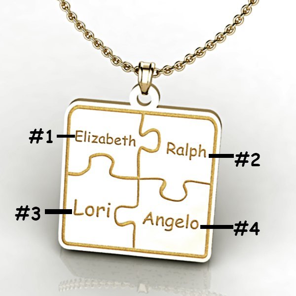 This Personalized Family Four Piece Jigsaw Puzzle Pendant includes an 18 Inch Chain. The perfect gift for Mom, Grandma, Sister, Aunt even Best Friend. This Pendant symbolizes how a family always comes together like a puzzle.