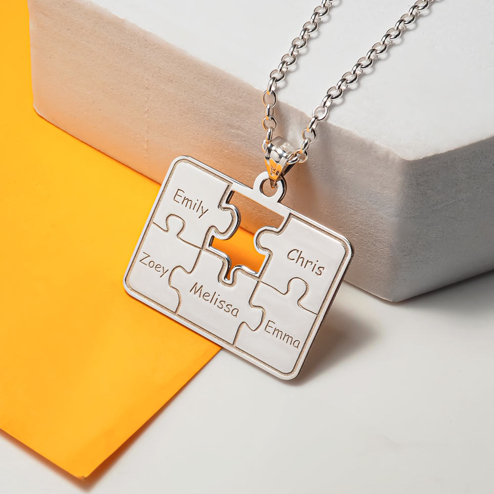 This Personalized Family Five Piece Jigsaw Puzzle Pendant includes an 18 Inch Chain. The perfect gift for Mom, Grandma, Sister, Aunt even Best Friend. This Pendant symbolizes how a family always comes together like a puzzle.