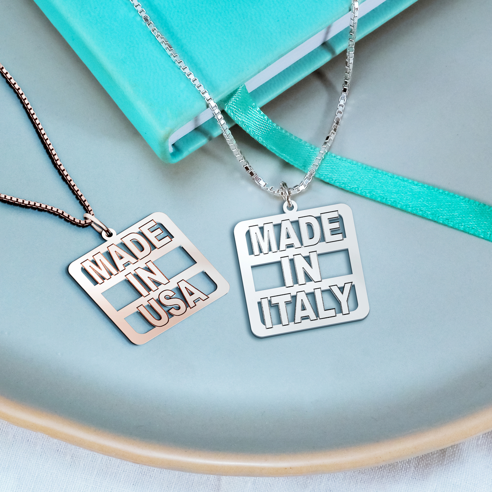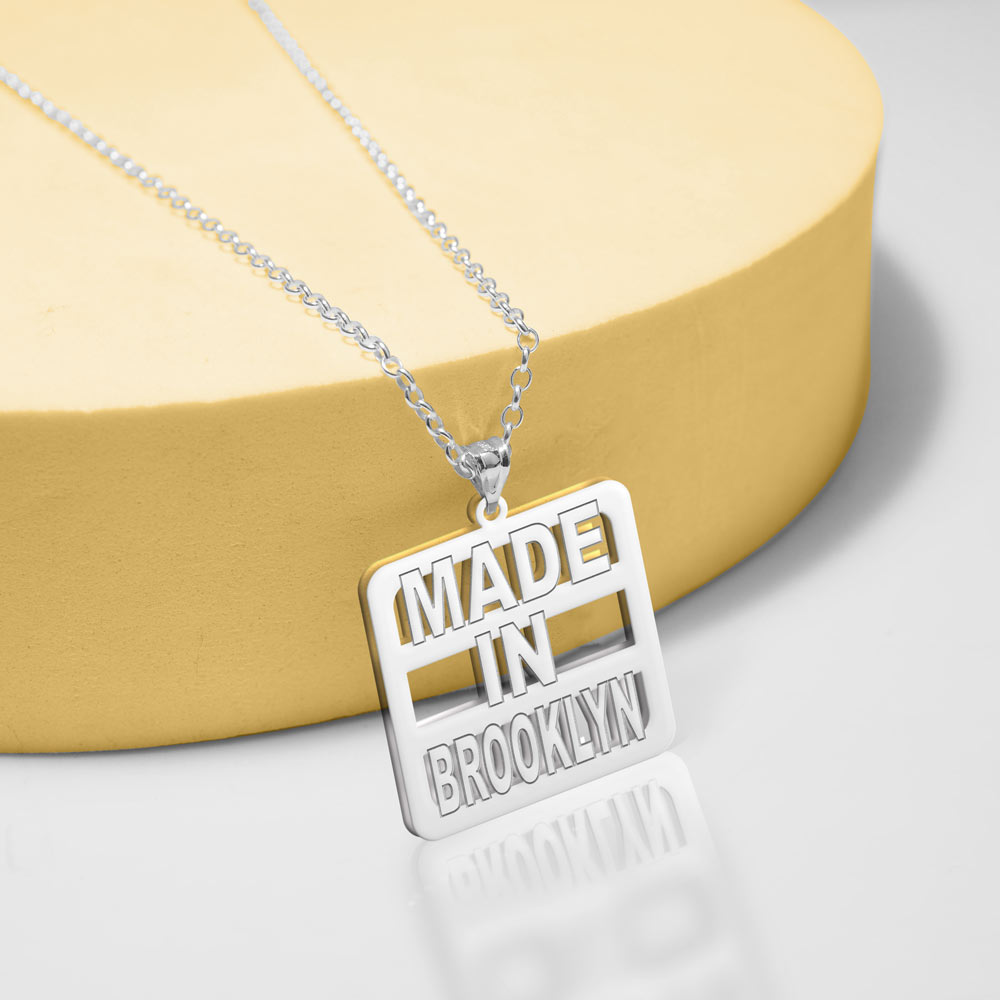 Personalize this pendant with any state, country, city that you would like. For Example, Made in New York.