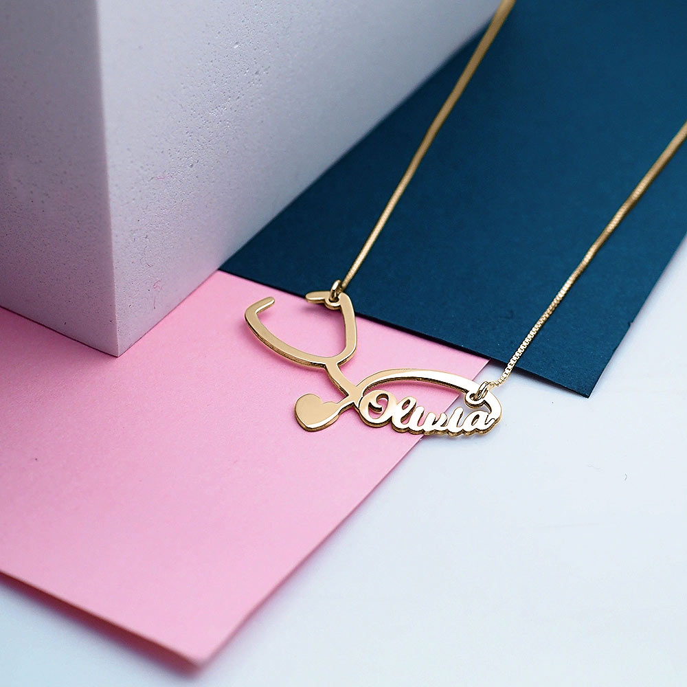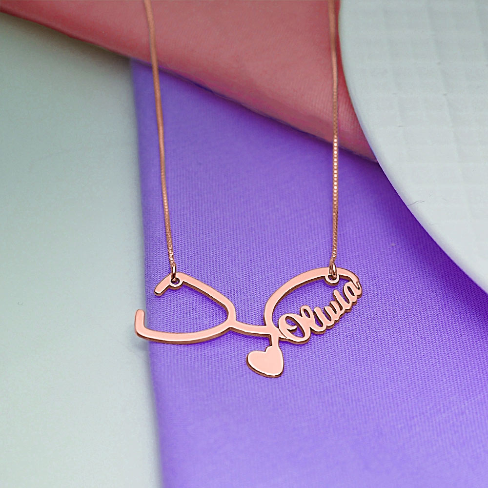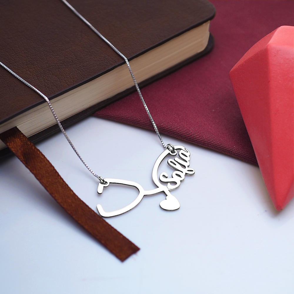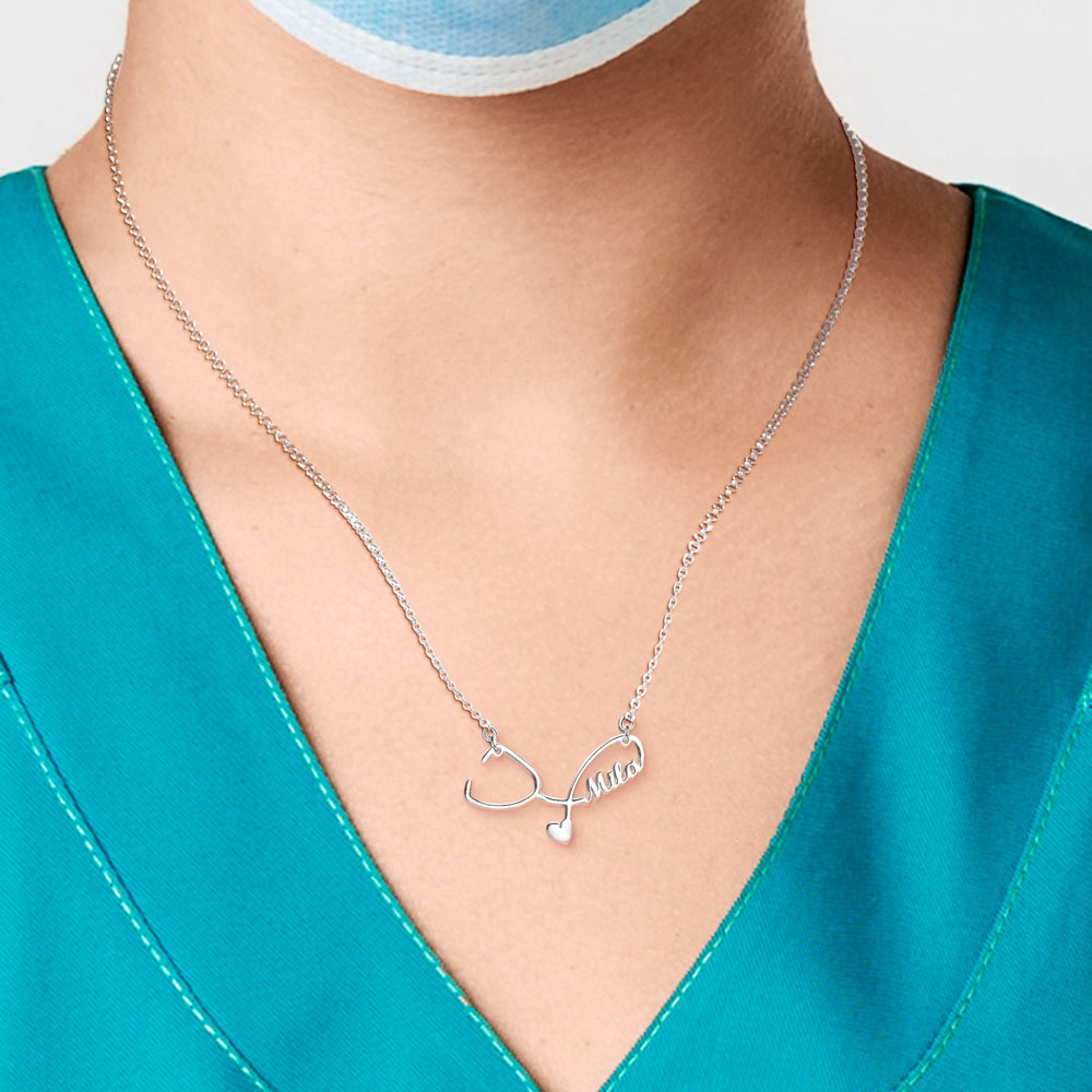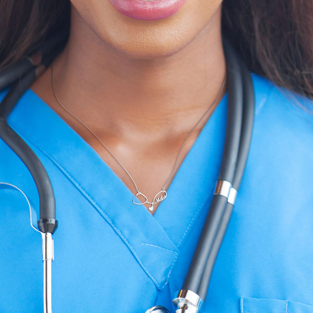 high polished nurses stethoscope name necklace is available in Solid .925 Sterling Silver, 14k Gold