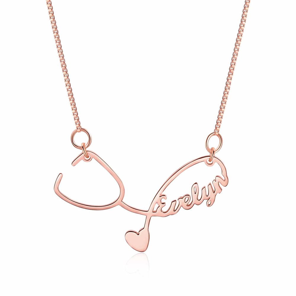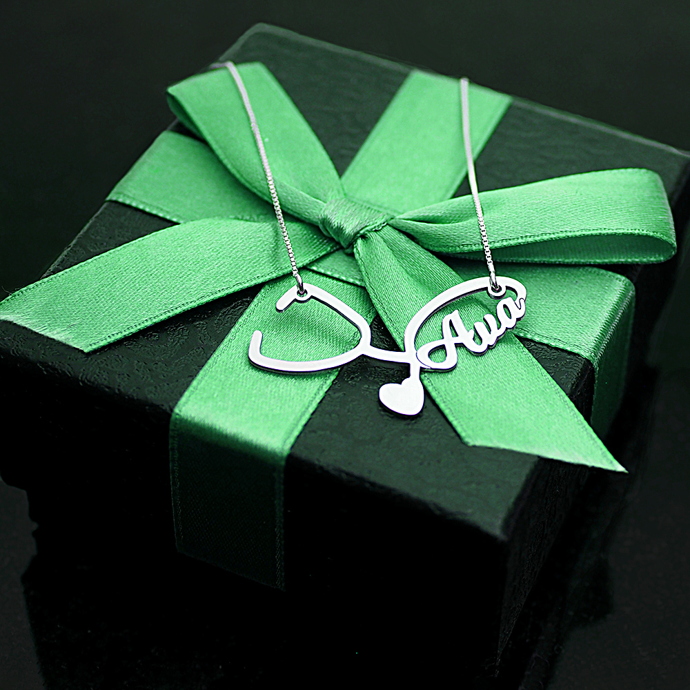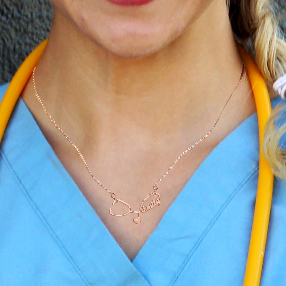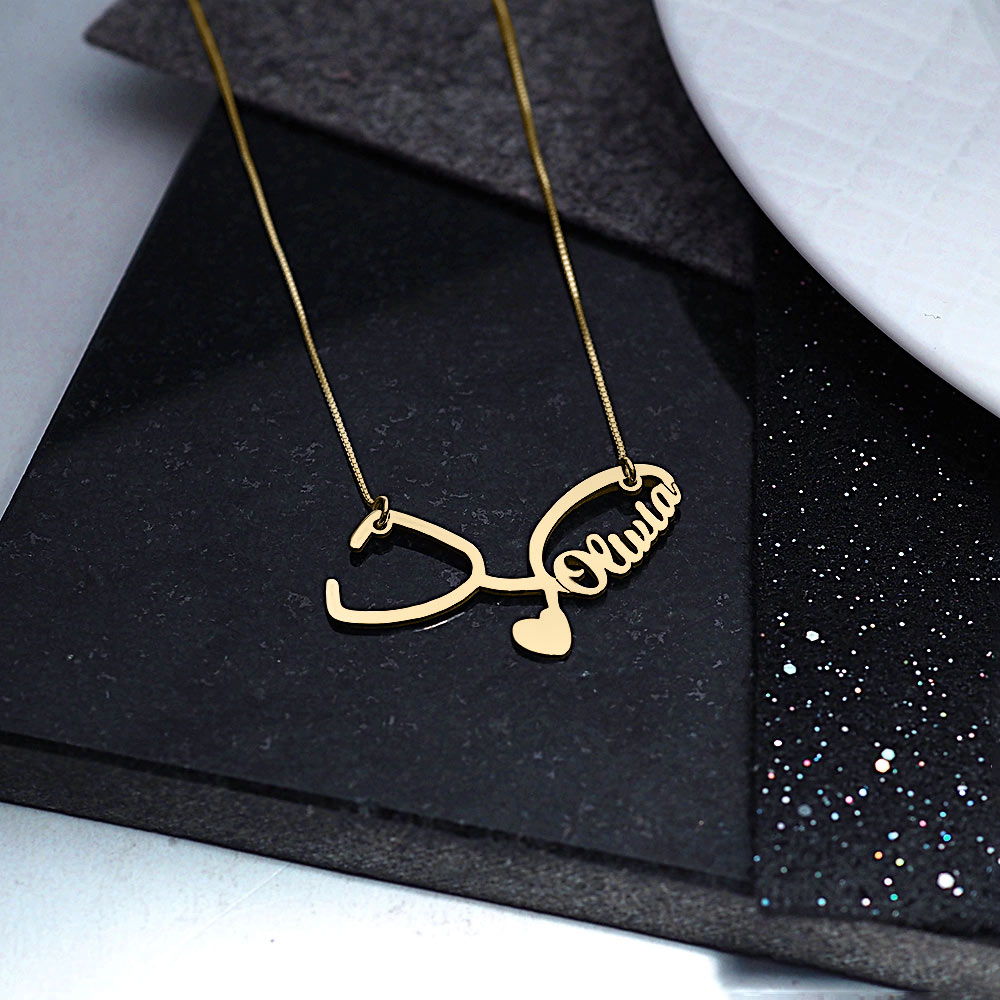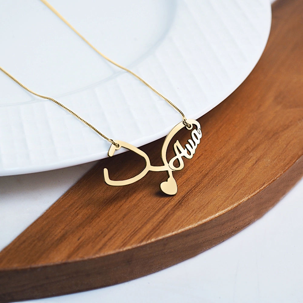 high polished nurses stethoscope name necklace is available in Solid .925 Sterling Silver, 14k Gold