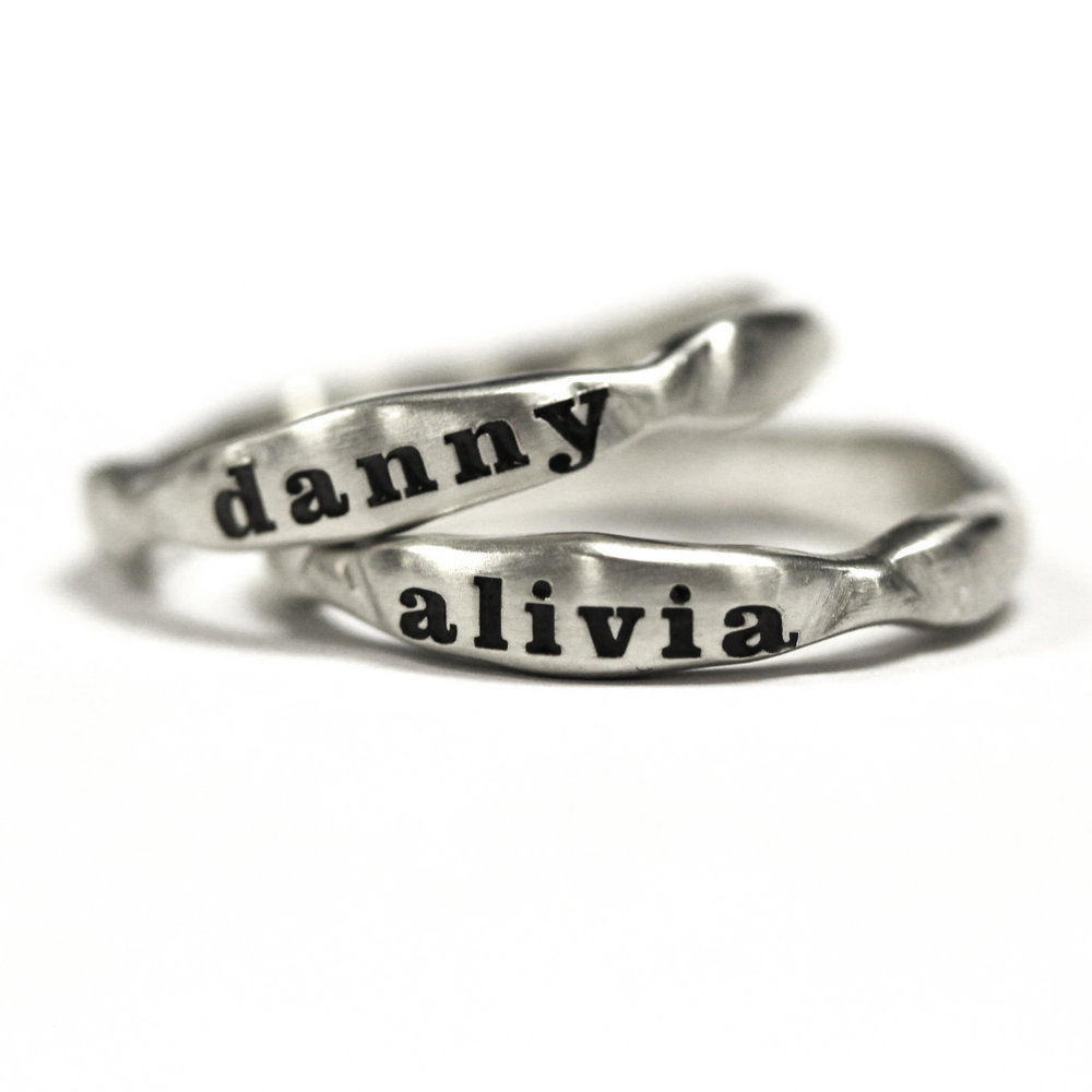 This sterling silver stackable ring is engraved with the name or word of your choice - then antiqued with the lettering.