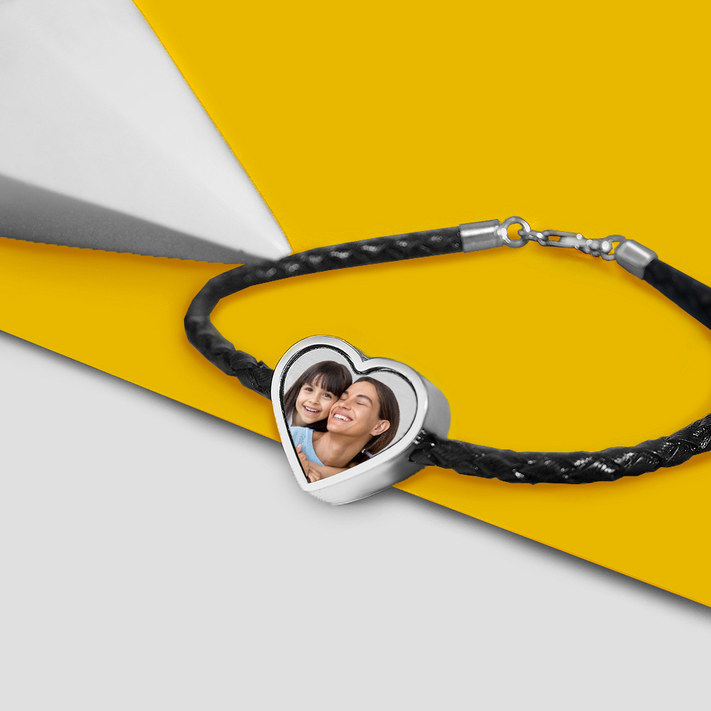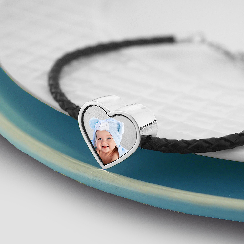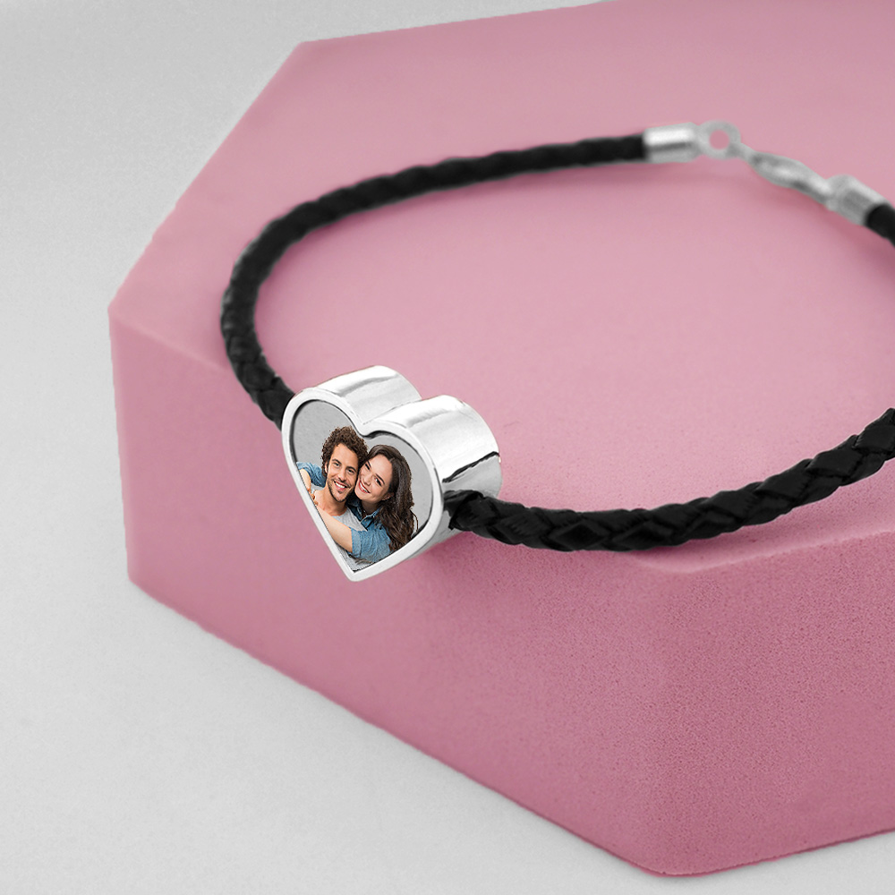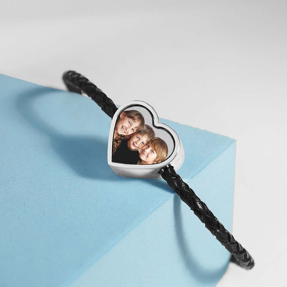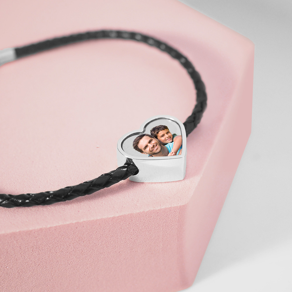 Photo Engraved Leather Rope Bracelet w/ Stainless Steel Heart Charm