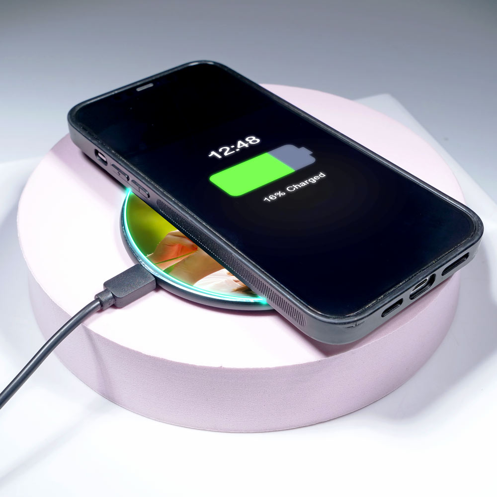 Drop and charge your device on this personalized wireless charging pad with super fast charging.