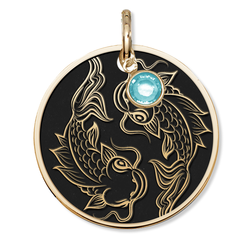 The birthstone that is dangling from the pendant is a Aquamarine, but it can be switched to any stone upon your request