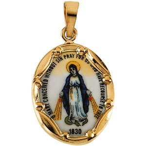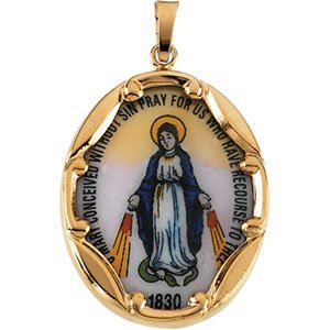 This Miraculous Medal is Hand Painted Porcelain that is then fired and set in a 14K Solid Gold frame.