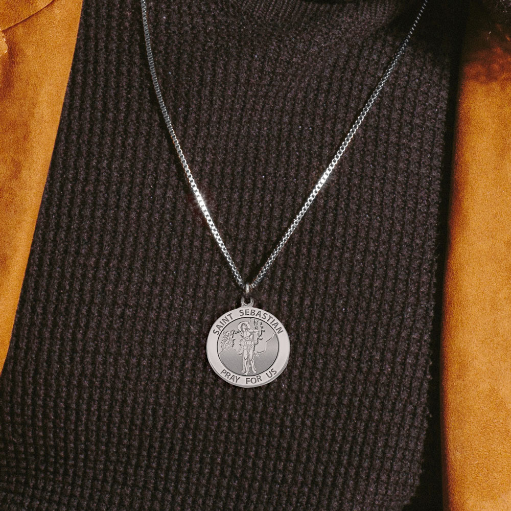 Saint Sebastian was a Christian saint and martyr, who is said to have been killed while the Roman emperor Diocletian engaged in the persecution of Christians in the 3rd century. He is commonly depicted in art and literature tied to a post and shot with arrows just like on this medal. He is patron saint to Soldiers, plagues, arrows, athletes and unofficially youth.