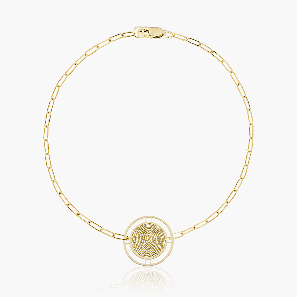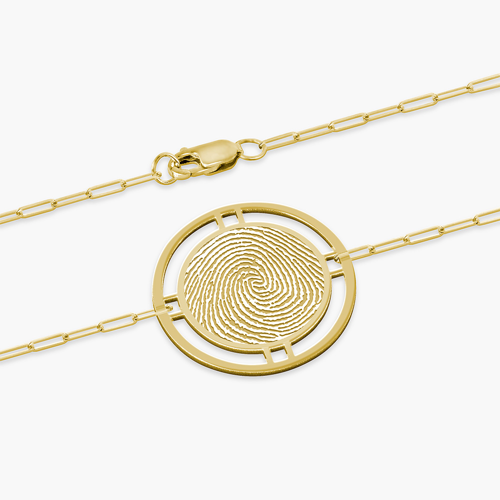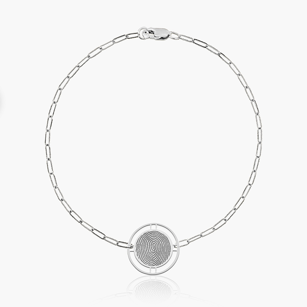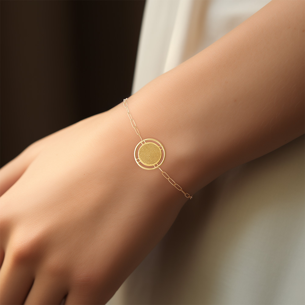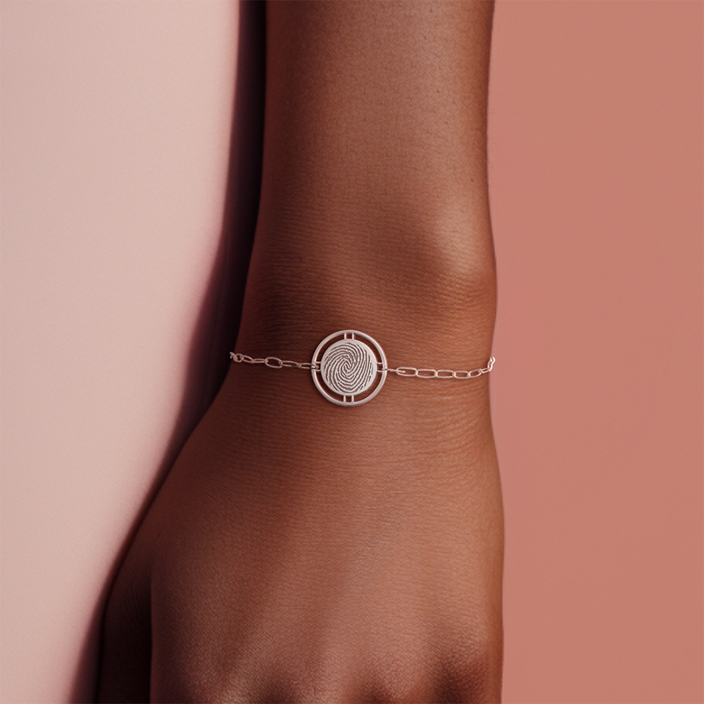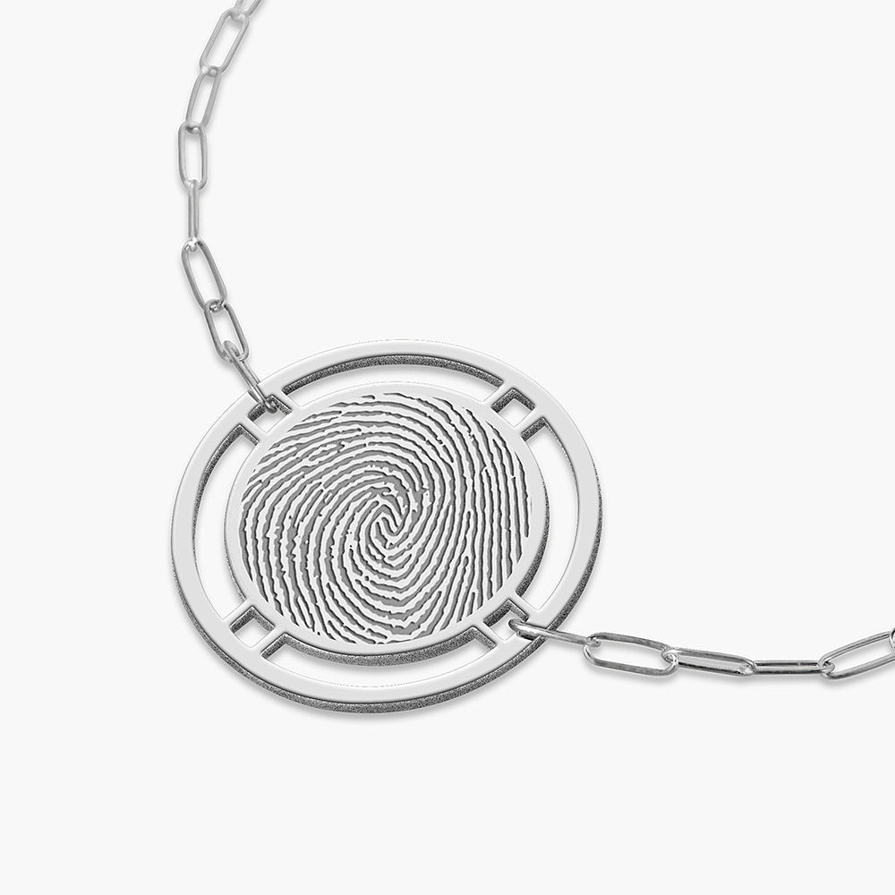 Embrace the beauty of individuality with the Round Fingerprint Pendant with Open Border Paperclip Bracelet, a piece that carries a personal story and adds a touch of elegance to your jewelry collection. At the heart of the bracelet is a round pendant featuring an intricate fingerprint design, symbolizing uniqueness and personal connection. The open border around the fingerprint adds a touch of sophistication and highlights the detailed pattern beautifully. Expertly crafted from premium materials, this bracelet promises both durability and a luxurious feel. The metal is meticulously polished to a radiant shine, ensuring a lasting, elegant appearance. The fingerprint pendant can be personalized, allowing you to immortalize a loved one's fingerprint or your own, adding a deeply personal and sentimental touch to the piece. Ideal for both everyday wear and special occasions, this bracelet seamlessly transitions from casual to formal settings. Its versatile design makes it a timeless accessory that enhances any outfit. Elegantly packaged in a stylish jewelry box, this bracelet makes a heartfelt gift for birthdays, anniversaries, or any special occasion, celebrating personal connections and cherished memories.