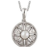 This Pendant comes with a 4 MM Freshwater Round Pearl and has .02 carats of diamonds. This item is approximately 3/4" x 1/2".
