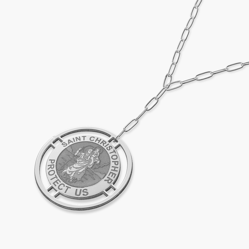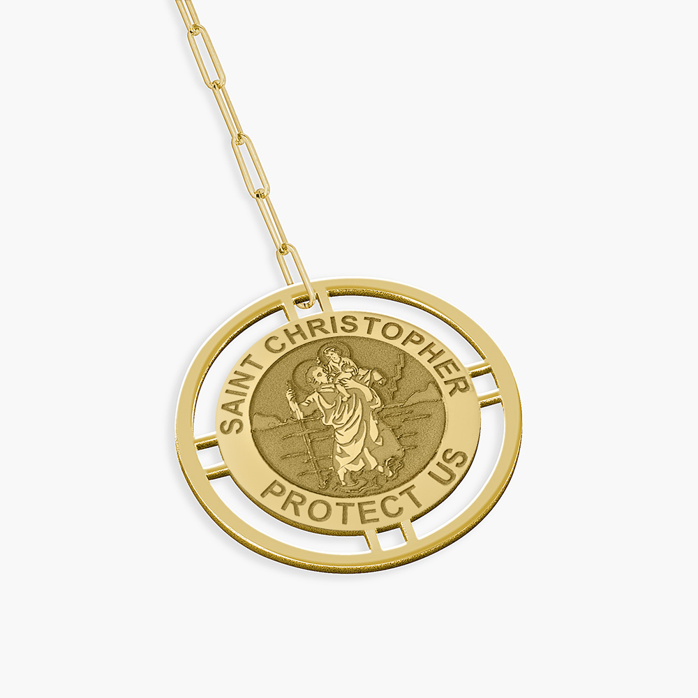 Embrace the beauty of individuality with the Round Saint Pendant with Open Border Paperclip Necklace, a piece that carries a personal story and adds a touch of elegance to your jewelry collection. At the heart of the Necklace is a round pendant featuring an intricate religious design, symbolizing uniqueness and personal connection. The open border around the saint adds a touch of sophistication and highlights the detailed pattern beautifully. Expertly crafted from premium materials, this Necklace promises both durability and a luxurious feel. The metal is meticulously polished to a radiant shine, ensuring a lasting, elegant appearance. This Saint pendant can be personalized, allowing you to immortalize a loved one's faith by adding a deeply personal and sentimental message to the piece. Ideal for both everyday wear and special occasions, this necklace seamlessly transitions from casual to formal settings. Its versatile design makes it a timeless accessory that enhances any outfit. Elegantly packaged in a stylish jewelry box, this necklace makes a heartfelt gift for birthdays, anniversaries, holy sacraments, or any special occasion, celebrating personal connections and cherished memories.
