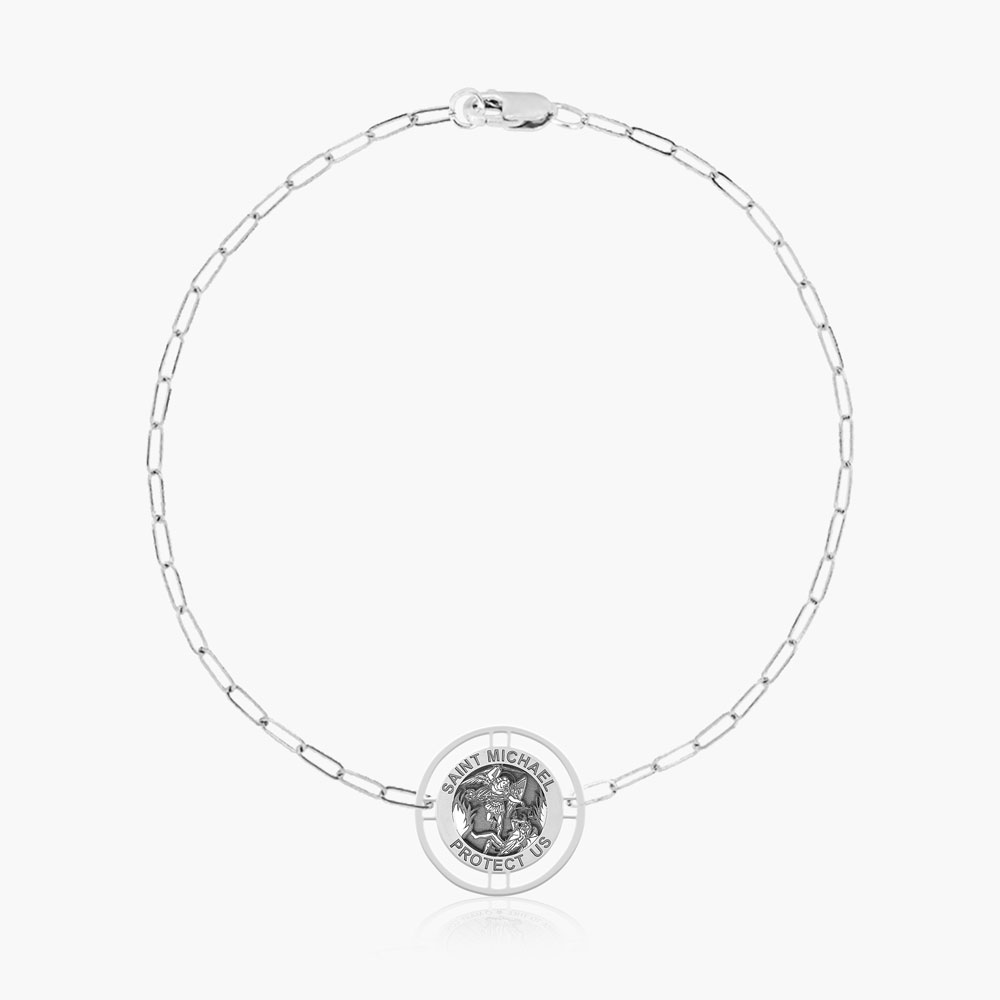 Embrace the beauty of individuality with the Round Saint Pendant with Open Border Paperclip Bracelet, a piece that carries a personal story and adds a touch of elegance to your jewelry collection. At the heart of the bracelet is a round pendant featuring an intricate religious design, symbolizing uniqueness and personal connection. The open border around the saint adds a touch of sophistication and highlights the detailed pattern beautifully. Expertly crafted from premium materials, this bracelet promises both durability and a luxurious feel. The metal is meticulously polished to a radiant shine, ensuring a lasting, elegant appearance. This Saint pendant can be personalized, allowing you to immortalize a loved one's faith by adding a deeply personal and sentimental message to the piece. Ideal for both everyday wear and special occasions, this bracelet seamlessly transitions from casual to formal settings. Its versatile design makes it a timeless accessory that enhances any outfit. Elegantly packaged in a stylish jewelry box, this bracelet makes a heartfelt gift for birthdays, anniversaries, holy sacraments, or any special occasion, celebrating personal connections and cherished memories.
