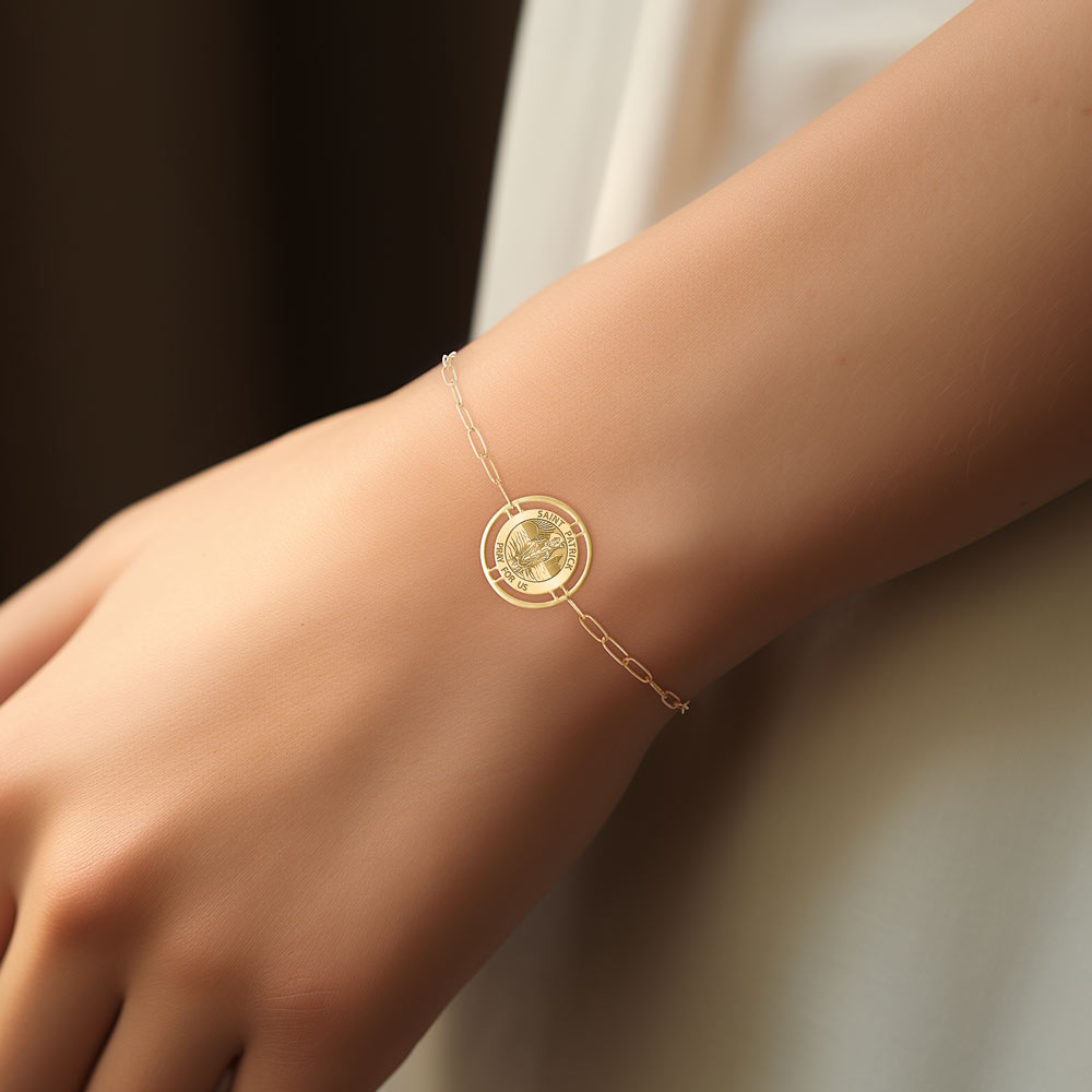 Embrace the beauty of individuality with the Round Saint Pendant with Open Border Paperclip Bracelet, a piece that carries a personal story and adds a touch of elegance to your jewelry collection. At the heart of the bracelet is a round pendant featuring an intricate religious design, symbolizing uniqueness and personal connection. The open border around the saint adds a touch of sophistication and highlights the detailed pattern beautifully. Expertly crafted from premium materials, this bracelet promises both durability and a luxurious feel. The metal is meticulously polished to a radiant shine, ensuring a lasting, elegant appearance. This Saint pendant can be personalized, allowing you to immortalize a loved one's faith by adding a deeply personal and sentimental message to the piece. Ideal for both everyday wear and special occasions, this bracelet seamlessly transitions from casual to formal settings. Its versatile design makes it a timeless accessory that enhances any outfit. Elegantly packaged in a stylish jewelry box, this bracelet makes a heartfelt gift for birthdays, anniversaries, holy sacraments, or any special occasion, celebrating personal connections and cherished memories.