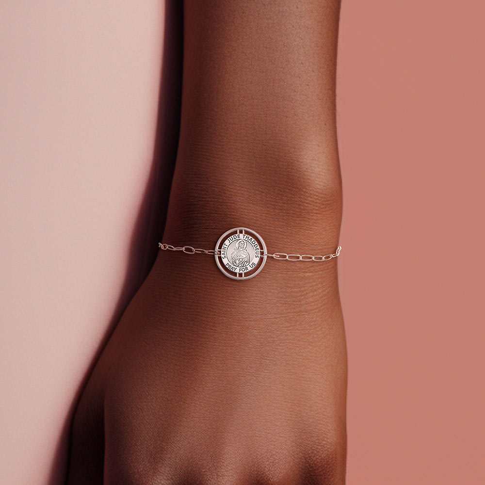 Embrace the beauty of individuality with the Round Saint Pendant with Open Border Paperclip Bracelet, a piece that carries a personal story and adds a touch of elegance to your jewelry collection. At the heart of the bracelet is a round pendant featuring an intricate religious design, symbolizing uniqueness and personal connection. The open border around the saint adds a touch of sophistication and highlights the detailed pattern beautifully. Expertly crafted from premium materials, this bracelet promises both durability and a luxurious feel. The metal is meticulously polished to a radiant shine, ensuring a lasting, elegant appearance. This Saint pendant can be personalized, allowing you to immortalize a loved one's faith by adding a deeply personal and sentimental message to the piece. Ideal for both everyday wear and special occasions, this bracelet seamlessly transitions from casual to formal settings. Its versatile design makes it a timeless accessory that enhances any outfit. Elegantly packaged in a stylish jewelry box, this bracelet makes a heartfelt gift for birthdays, anniversaries, holy sacraments, or any special occasion, celebrating personal connections and cherished memories.