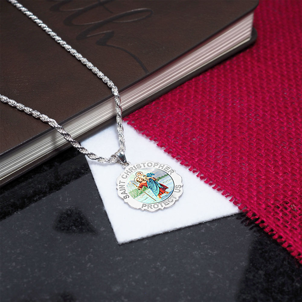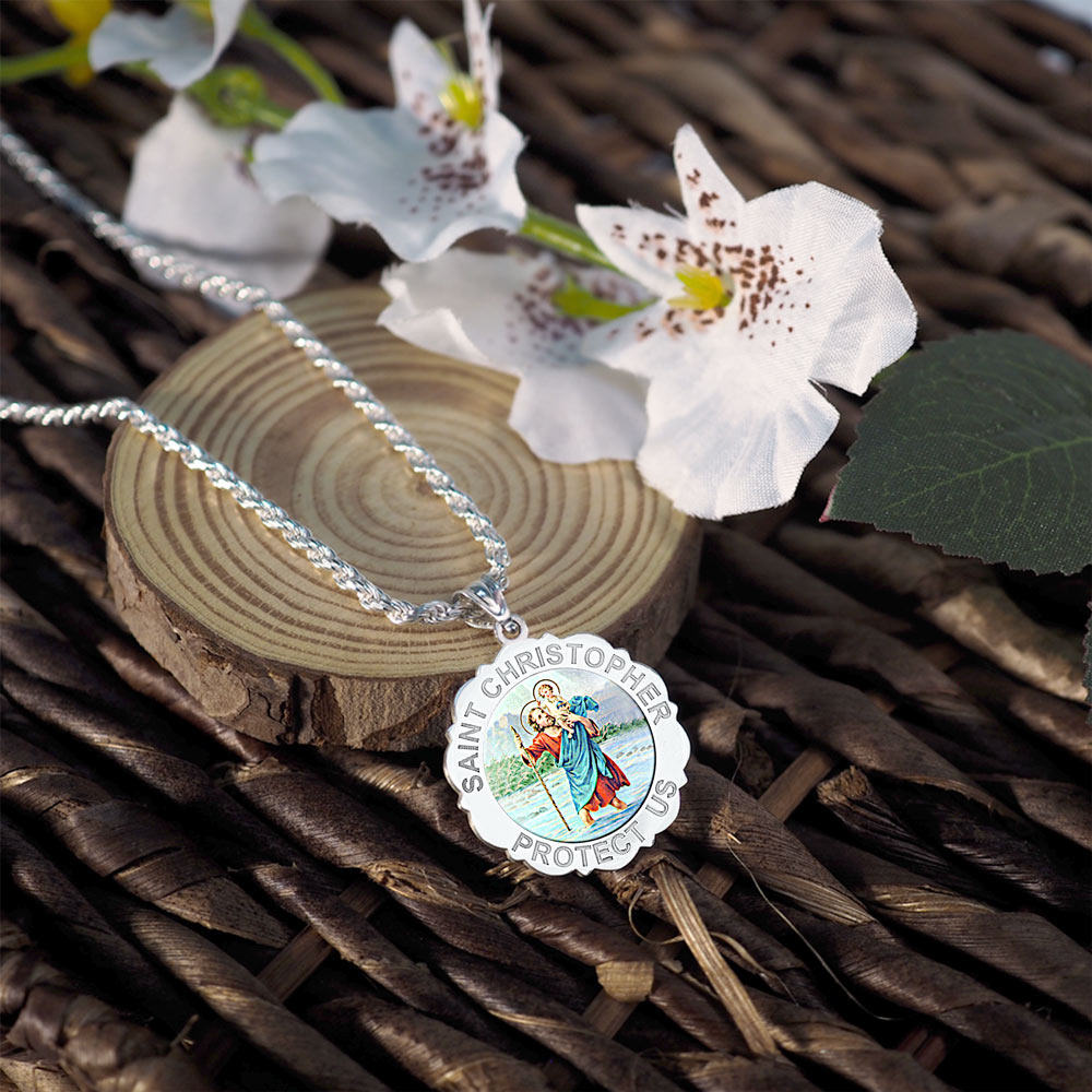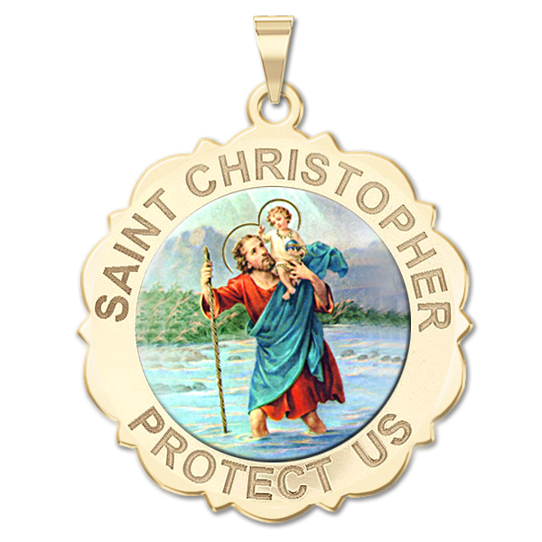Saint Christopher Scalloped Round Religious Medal - "Color EXCLUSIVE"