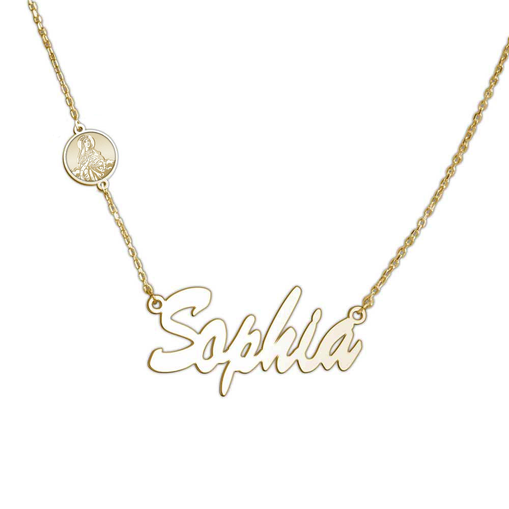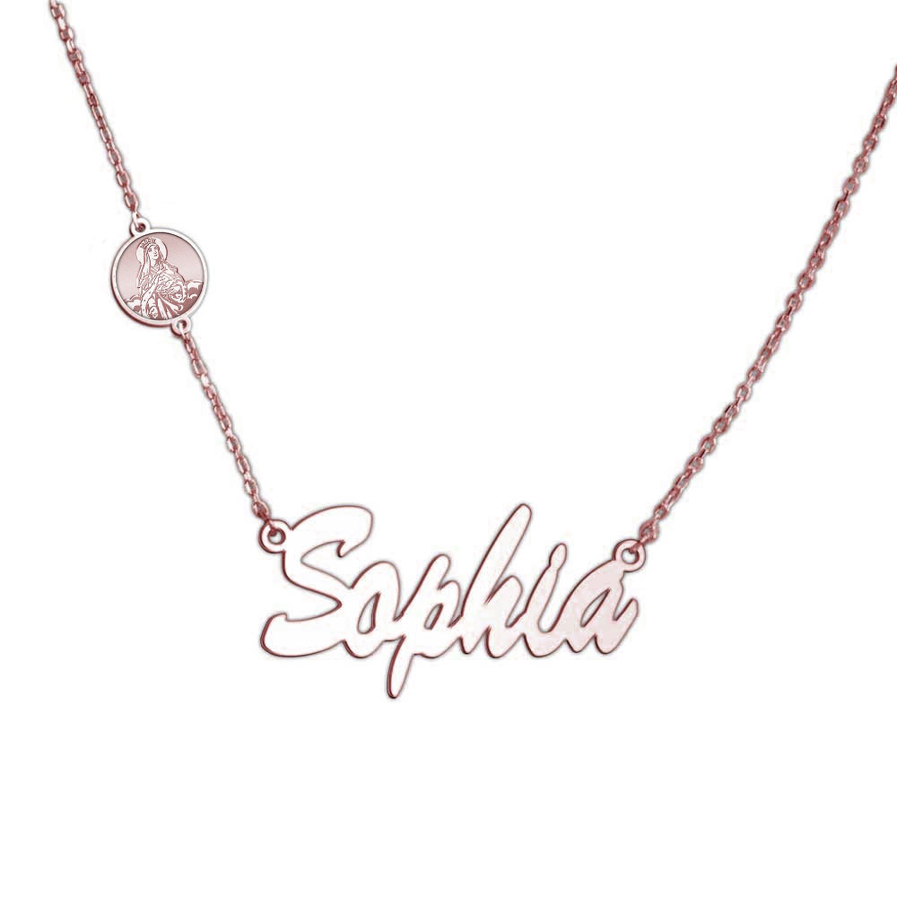 This Nameplate with Saint is an exclusive and unique item with Pictures On Gold. You can engrave the Back of the Saint charm attached to the chain! A Perfect gift to add their Confirmation Saint to their name. !