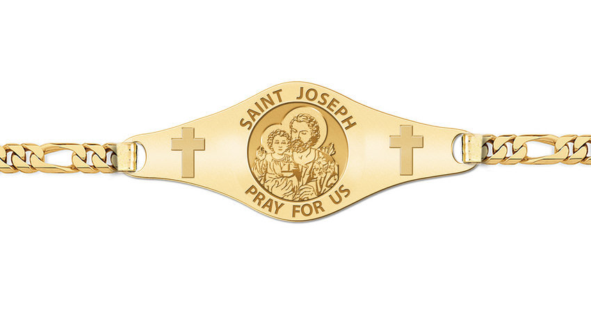 Joseph "of the House of David", also known as Saint Joseph, Joseph the Betrothed, Joseph of Nazareth, Joseph the Worker and other titles) is known from the New Testament as the husband of Mary, mother of Jesus and although according to Christian tradition he was not the biological father of Jesus, he acted as his foster-father and as head of the Holy Family. Joseph is venerated as a saint within the Roman Catholic, Eastern Orthodox, and Anglican churches. The genealogy in the Gospel of Matthew says that Joseph's father was called Jacob; but according to the genealogy in the Gospel of Luke Joseph was a son of Heli. The canonical Gospels do not, however, give the date and place of Joseph's birth nor his death. All that is known from them is that Joseph lived at times in Nazareth in Galilee, stayed for a couple of years in Bethlehem in Judea, and was forced into exile for a time in Egypt. Joseph's profession is described in the Gospels as a , a Greek word for a variety of skilled craftsmen, but Christian tradition has him as a "carpenter", although the modern English words "joiner" or "cabinet-maker" might fit the sense of the Greek better. Very little other information on Joseph is given in the Gospels, in which he never speaks. His places of birth and death are not given, and his dates have been presented very differently at different periods; sometimes he has been seen as much older than Mary, and at other periods only slightly older. He is mentioned in the Gospels as present on the visit to Jerusalem when Jesus was twelve, but no mention can clearly be placed later than that one. Christian tradition, though vague on the time and place of his death, represents Mary as a widow during the adult ministry of her son. In the Roman Catholic and other traditions, Joseph is the patron saint of workers and has several feast days. He was also declared to be the patron saint and protector of the universal Catholic Church (along with Saint Peter) by Pope Pius IX in 1870, and is the patron of several countries and regions. He is a rare example of a saint from the early days of the church whose religious role has tended to increase in the centuries since the Middle Ages. * Comes with a Lobster Claw Clasp. * This bracelet is Unisex and can be for a man or woman. * 7 Inches is standard for women, 8 Inches is standard for men. * 1/2 Inches Tall x 1 3/4 Inches Wide Mens * 1/3 Inches Tall x 1 1/2 Inches Wide- Womens 14k Yellow Gold * Specific sizes are available, just let us know in the special instructions box provided.
