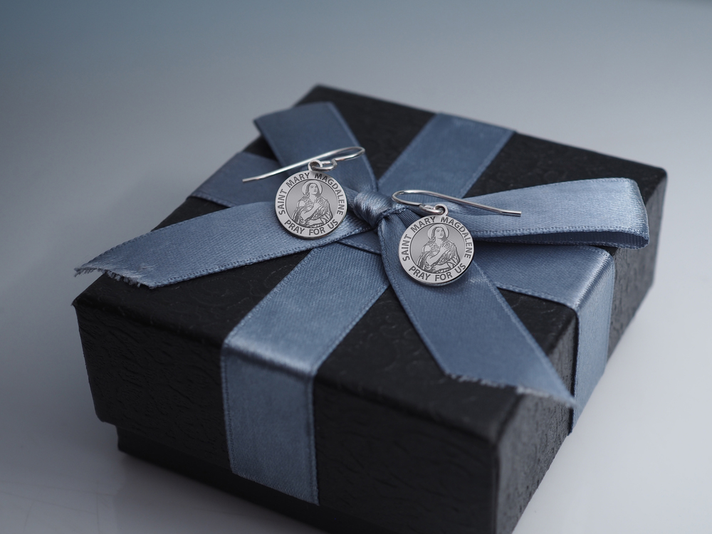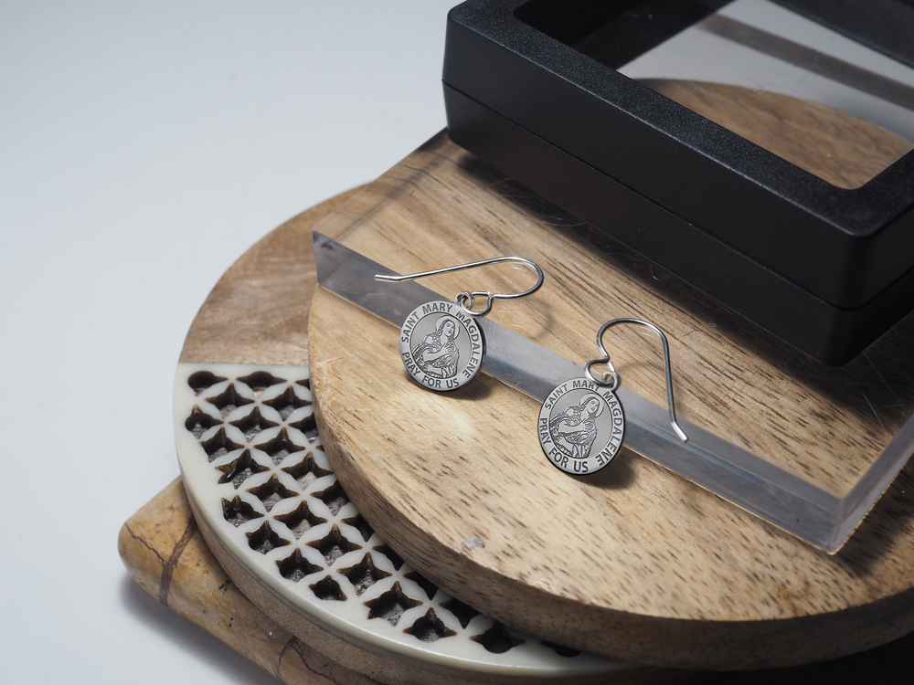 Saint Mary Magdalene is described, both in the canonical New Testament and in the New Testament apocrypha, as a devoted disciple of Jesus. She is considered by the Roman Catholic, Eastern Orthodox, and Anglican churches to be a saint, with a feast day of July 22. She is also commemorated by the Lutheran Church with a festival on the same day. The Orthodox Church also commemorates her on the Sunday of the Myrrhbearers, which is the second Sunday after Pascha (Easter). Mary Magdalene's name identifies her as "of Magdala" the town she came from, on the western shore of the Sea of Galilee and thus distinguishes her from the other Marys referred to throughout the New Testament. She is the patron saint of hairdressers and apothecaries; Atrani, Italy; Casamicciola Terme, Ischia; contemplative life; converts; glove makers; penitent sinners; people ridiculed for their piety; perfumeries; pharmacists; reformed prostitutes; sexual temptation; tanners; women *Price Per Pair * Each Earring is 15mm / 1/2" inch (smaller than a dime)