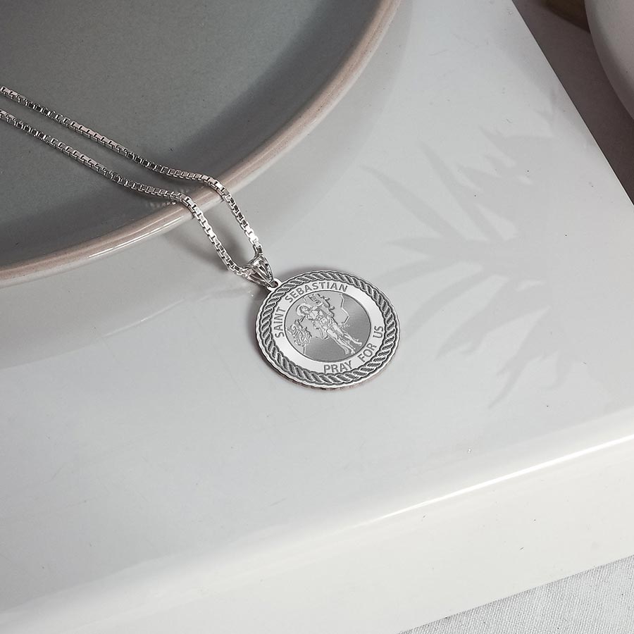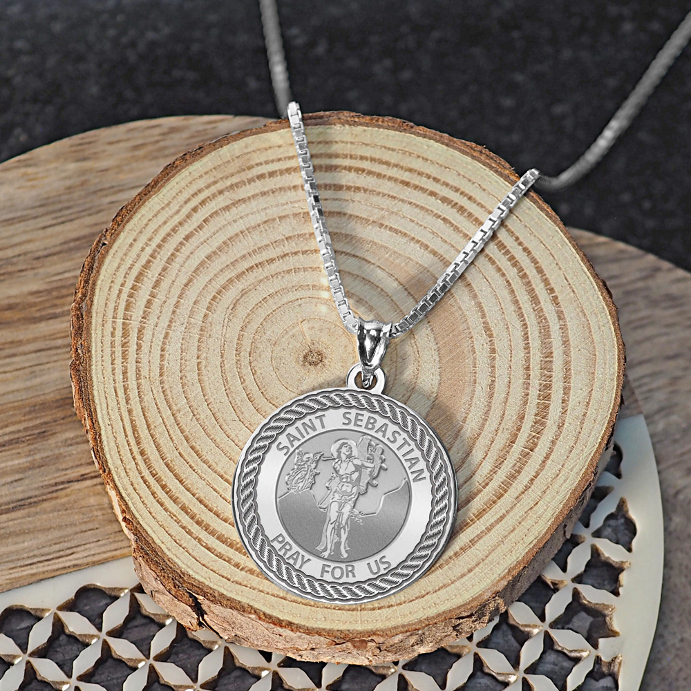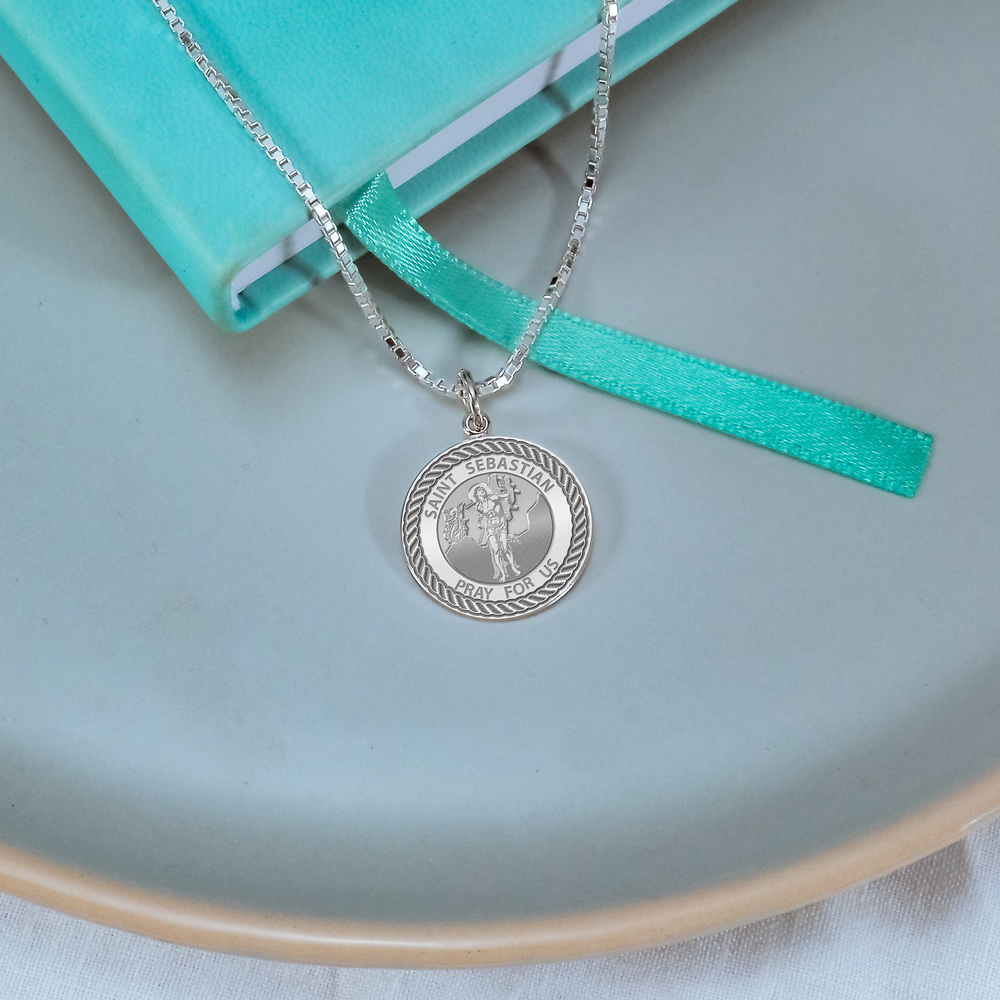 Saint Sebastian was a Christian saint and martyr, who is said to have been killed while the Roman emperor Diocletian engaged in the persecution of Christians in the 3rd century. He is commonly depicted in art and literature tied to a post and shot with arrows just like on this medal. He is patron saint to Soldiers, plagues, arrows, athletes and unofficially youth.
