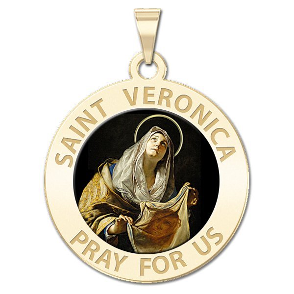 Saint Veronica was a pious woman of Jerusalem who, moved with pity as Jesus carried his cross to Golgotha, gave him her veil that he might wipe his forehead. Jesus accepted the offering and after using it handed it back to her, the image of His face miraculously impressed upon it. The name "Veronica" itself is a latinisation of Berenice, a Macedonian name, meaning "bearer of victory"