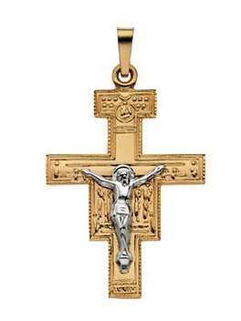 The San Damiano Cross is the icon cross that St. Francis of Assisi was praying before when he received the commission from the Lord to rebuild the Church. The original cross presently hangs in the Basilica of Saint Clare (Basilica di Santa Chiara) in Assisi. Franciscans cherish this cross as the symbol of their mission from God. The cross is called an icon cross because it contains images of people who have a part in the meaning of the cross. The tradition of such crosses began in the eastern Church and was transported by Serbian monks to the Umbria district of Italy. The San Damiano Cross was one of a number of crosses painted with similar figures during the 12th century in Umbria. The name of the painter is unknown, but it was fashioned around the year 1100. The purpose of an icon cross was to teach the meaning of the event depicted and thereby strengthen the faith of the people. The cross is called an icon cross because it contains images of persons who have a part in the meaning of the cross. The tradition of such crosses began in the Eastern Church and was carried by the Serbian Monks to the Umbrian district of Italy. The Byzantine style was common in Italy before Cimabue and Giotto. These conclusions have been reached based on a thorough study of the history of the cross and the literature concerning it. Very little literature is available in English. Most of it can only be read in Italian or French. The author also found it very helpful to compare the cross to similar crosses in Umbrian art. Finally, much of the English literature on the cross is faulty in its analysis since it dates back to sources prior to 1938 when the cross was restored to its original depiction. When the Poor Clares moved from San Damiano to the Basilica of Santa Chiara in 1257, they took the original San Damiano Cross with them and still guard it with great solicitude. It now hangs over the high altar of the Basilica of Santa Chiara. The crucifix hanging over the altar of the ancient church of San Damiano is a copy. All Franciscans cherish this cross as the symbol of their mission from God to commit our lives and resources to renew and rebuild the Church in the power of God.