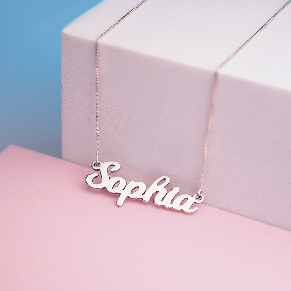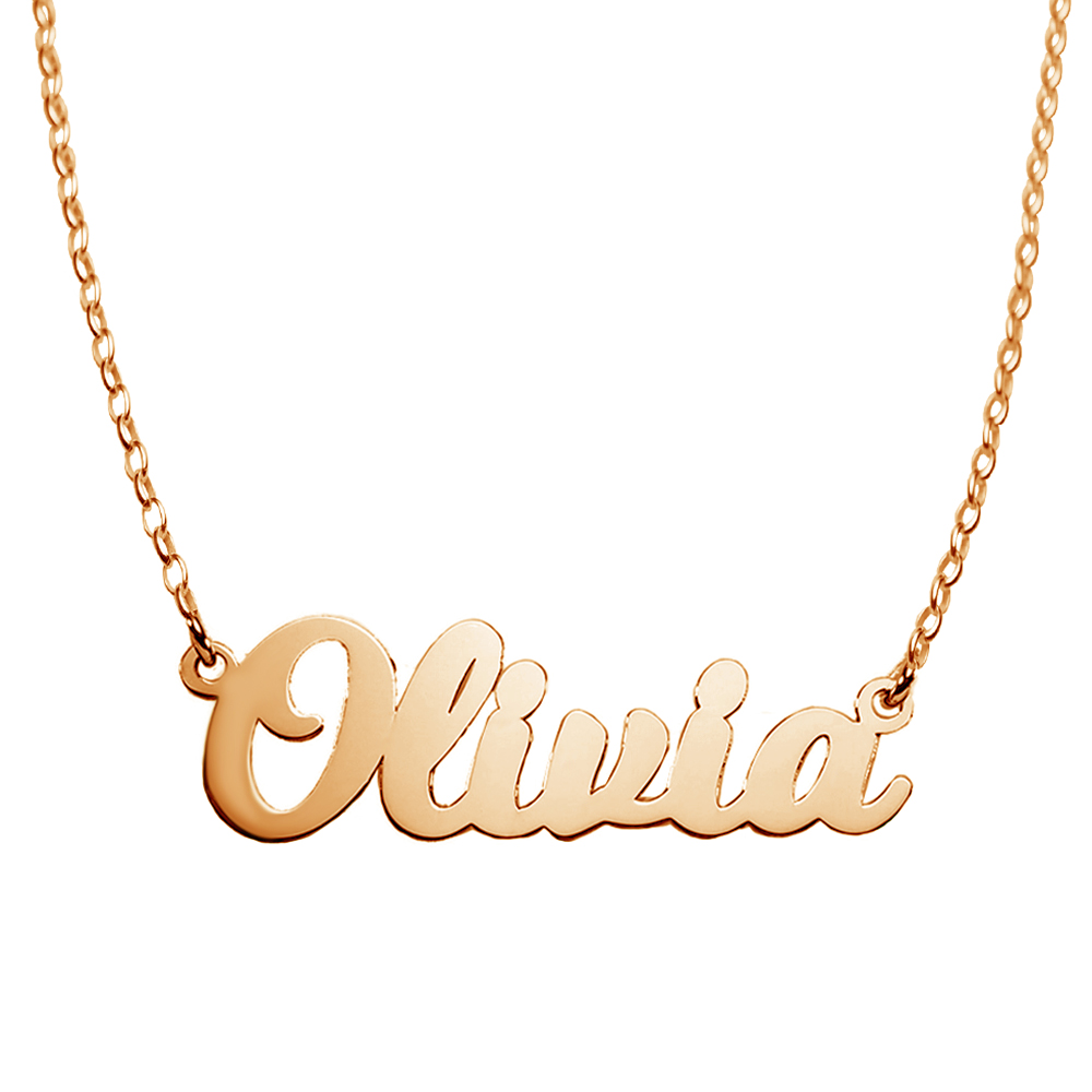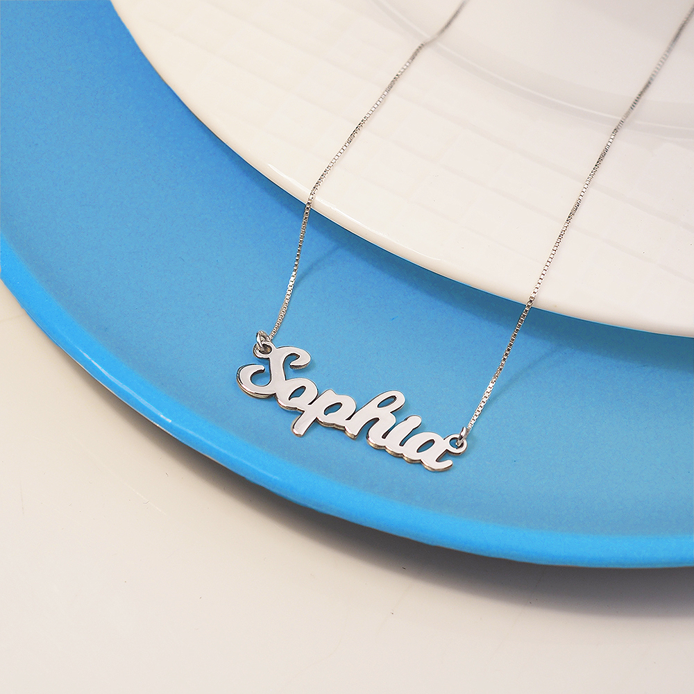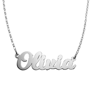 high polished script nameplate is available in Solid .925 Sterling Silver, 14k Gold
