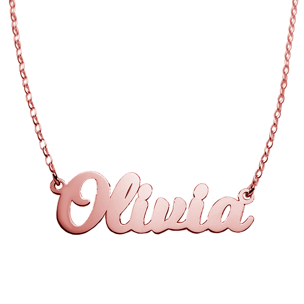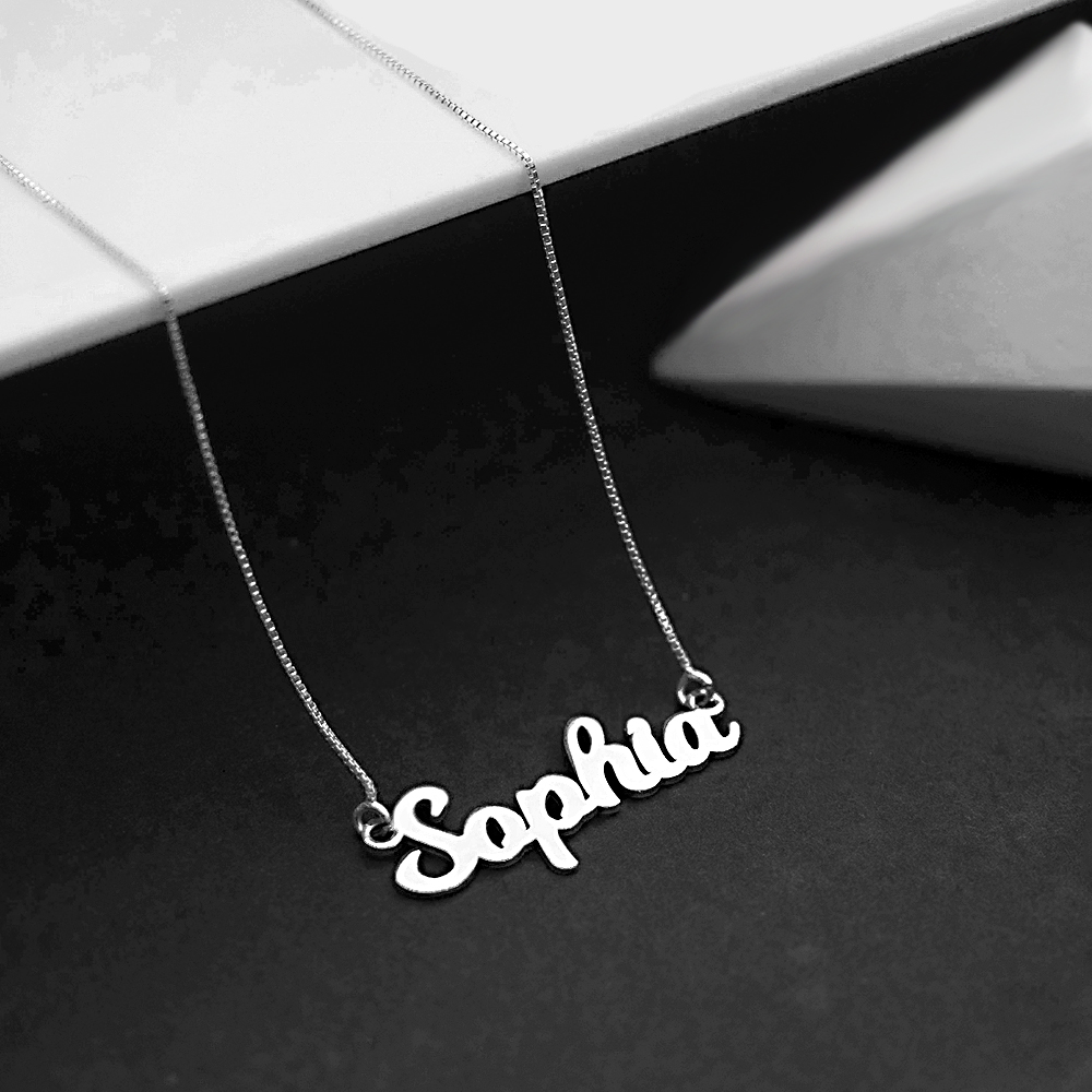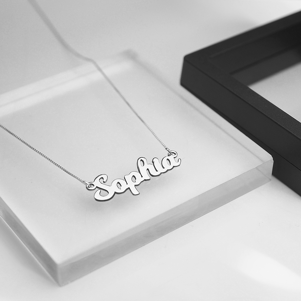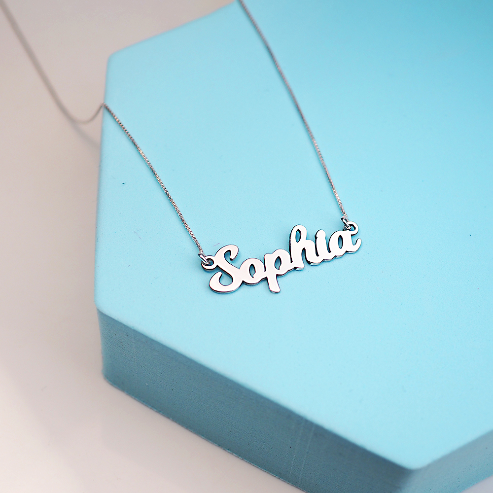 high polished script nameplate is available in Solid .925 Sterling Silver, 14k Gold