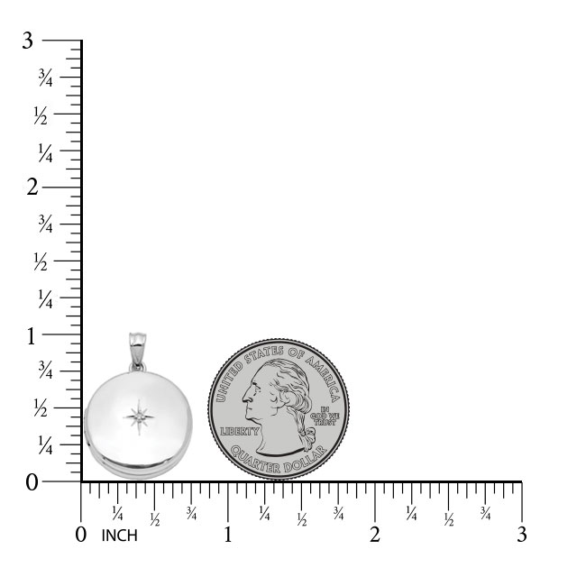 This .925 Solid Sterling Silver Locket has a high polished front side with a genuine diamond in the center. It holds 2 photos and can be engraved on the reverse and inside.