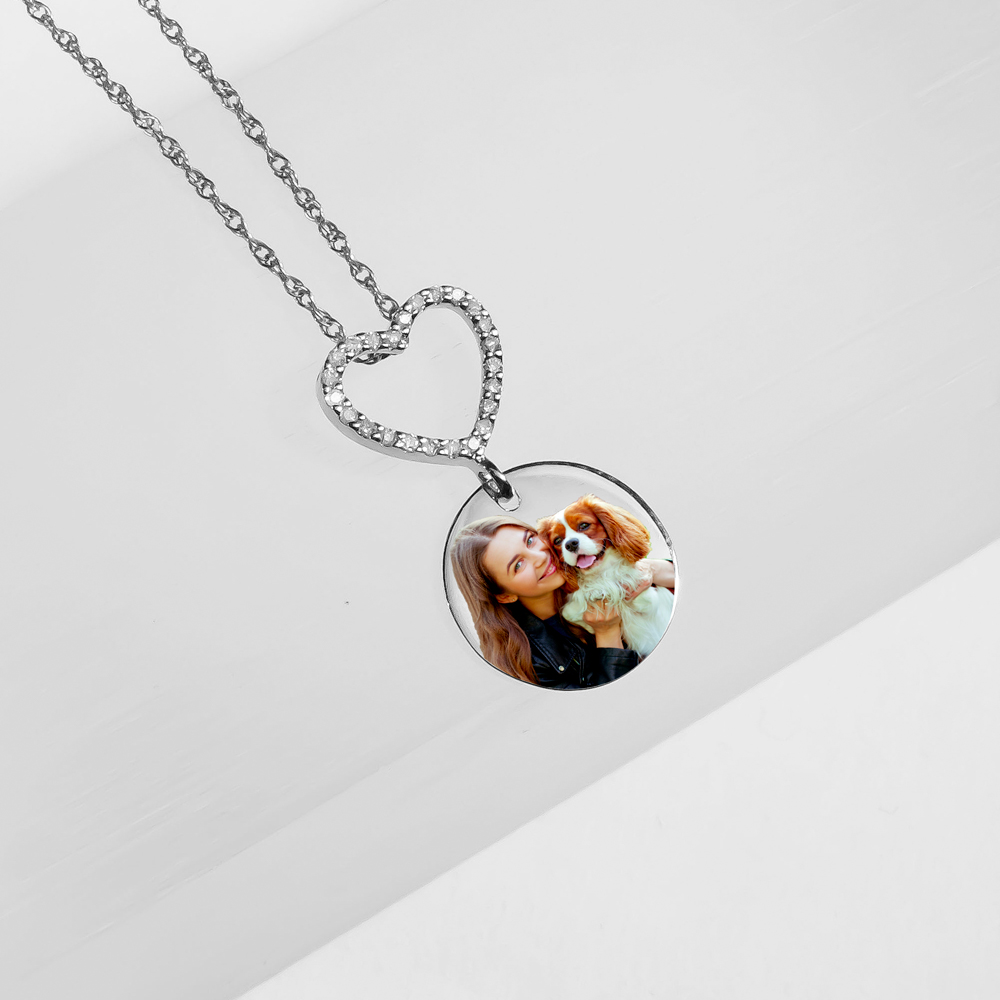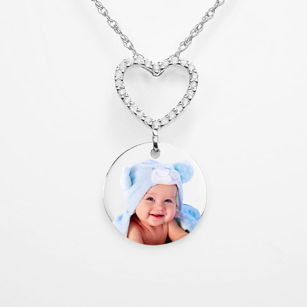 This beautifully hand set Diamond photo engraved pendant is trimmed with 24 beautiful 1 point diamonds (approx. 1/4 carat.)