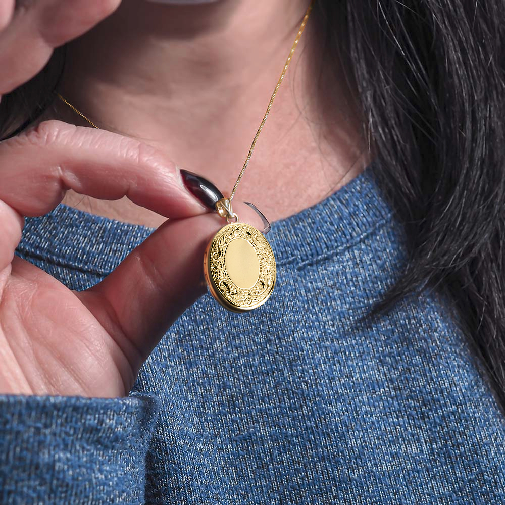 Solid 14K Yellow Gold Petite Oval Photo Locket with Floral Border