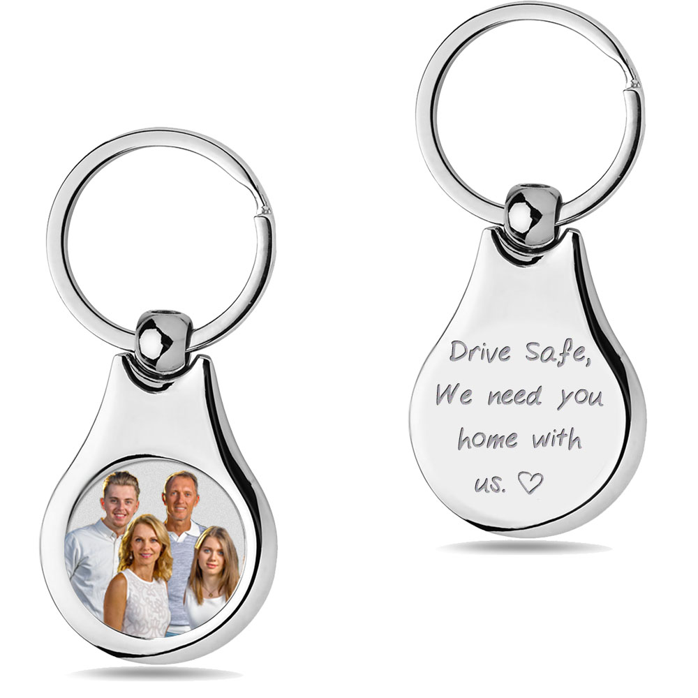 Keychain comes engraved with the saying "Drive Safe, we need you home with us" reminding the recipient to drive carefully that their loved ones are at home.