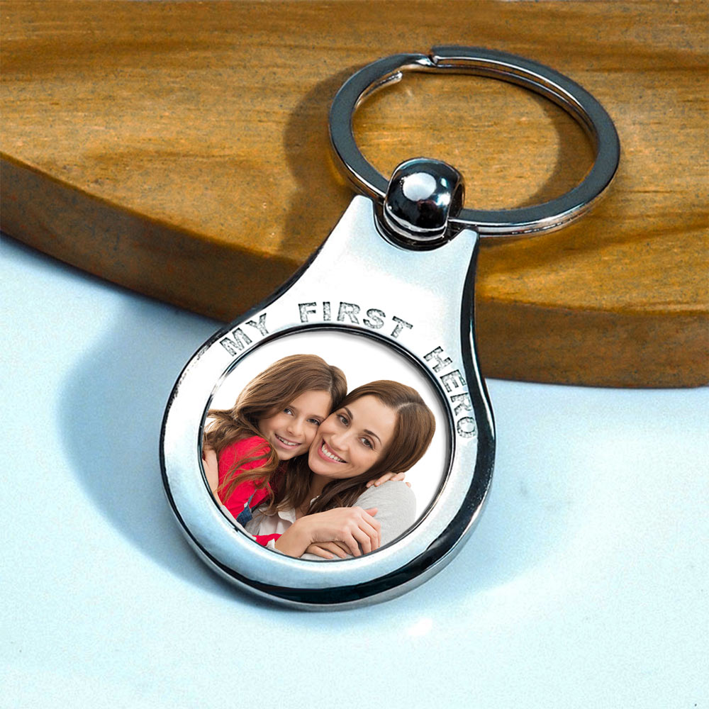Stainless Steel Engravable "My First Hero" Round Photo Laser Keychain