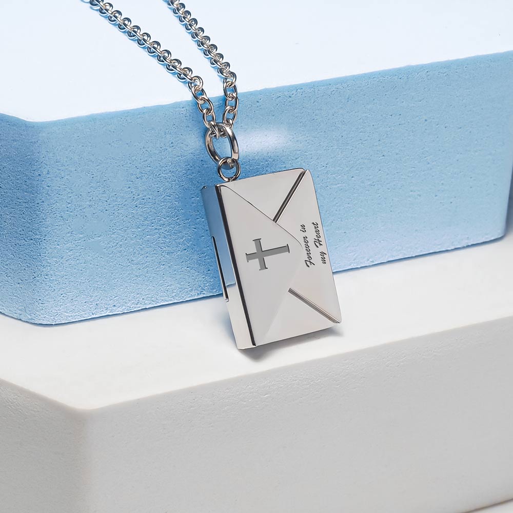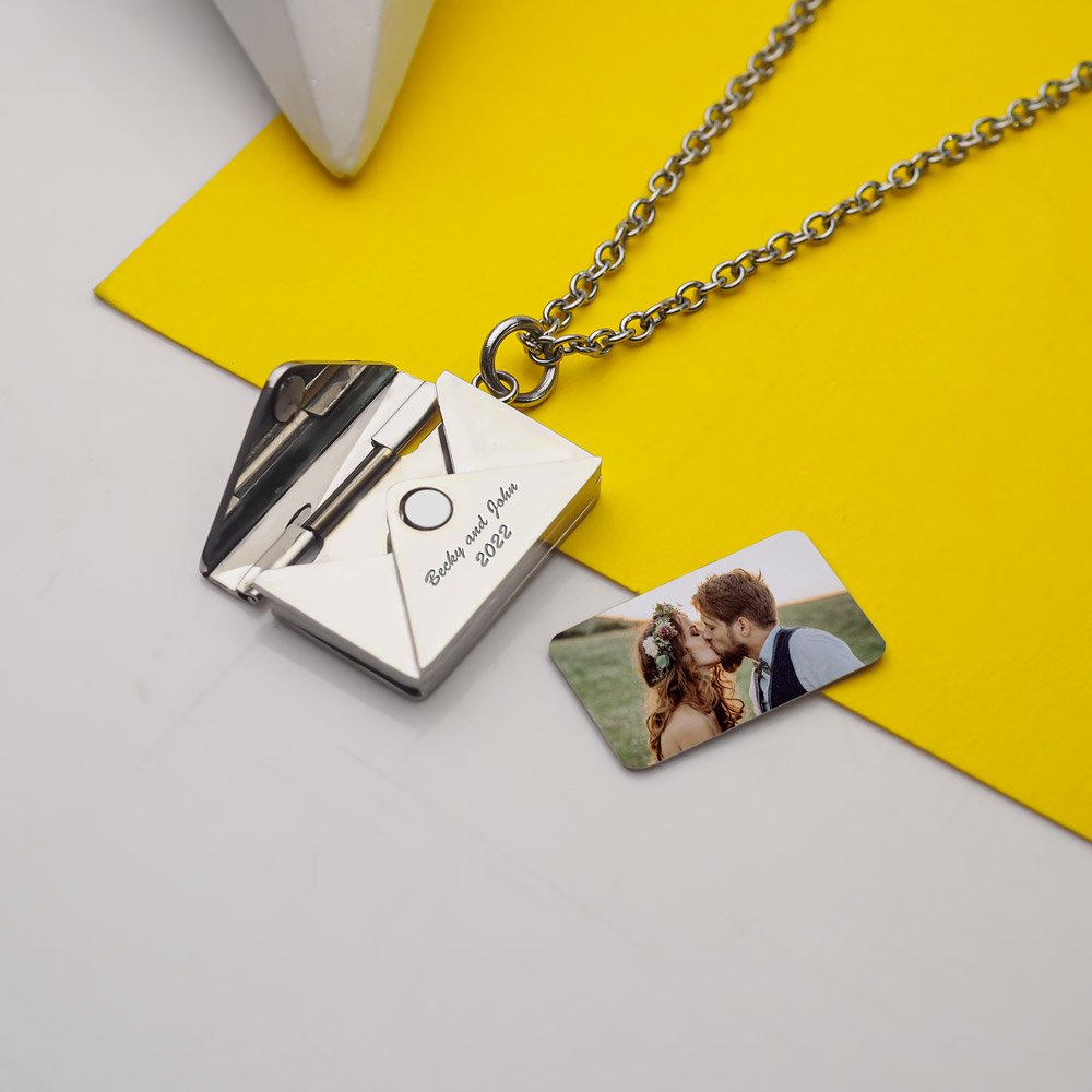 Engrave a personal message on the front or the back of actual Hanging Envelope Photo Locket.