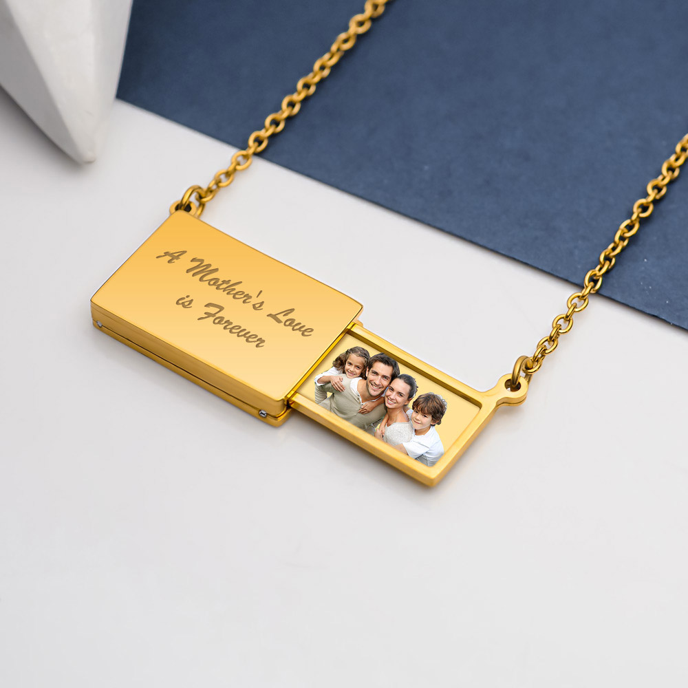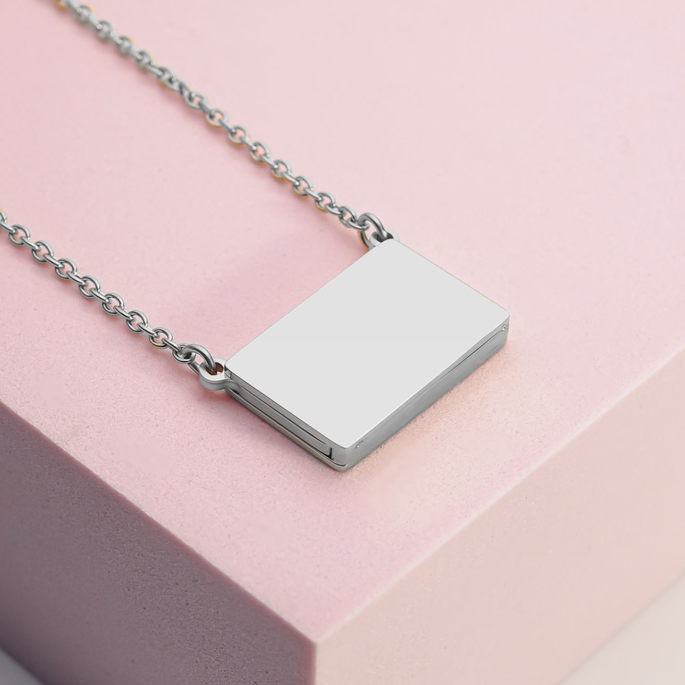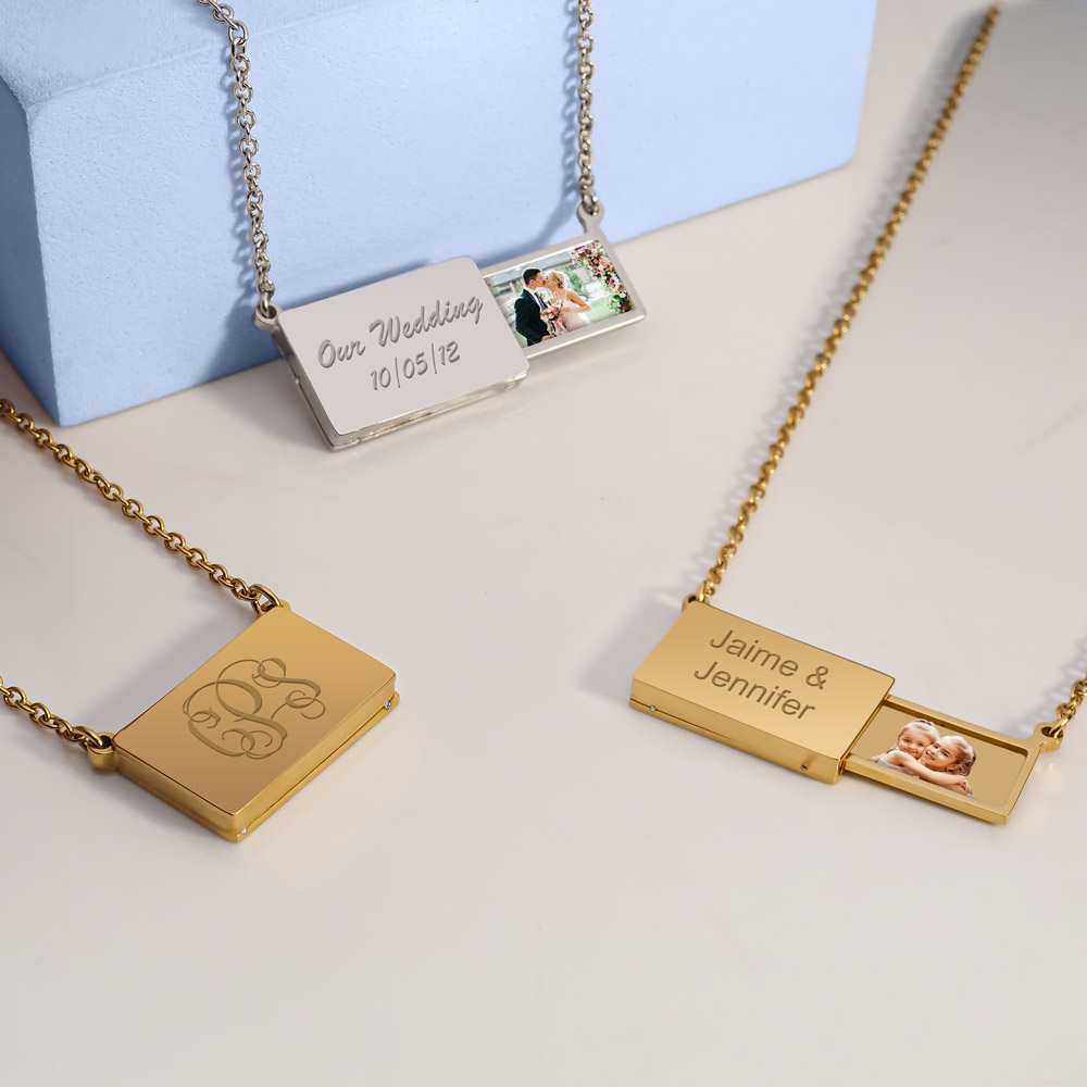 Engrave a personal message on the front or the back of actual Rectangle Slide Out Keepsake Photo Locket.