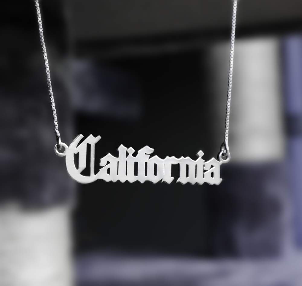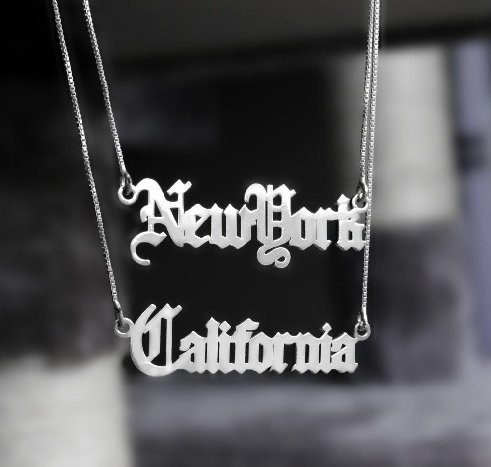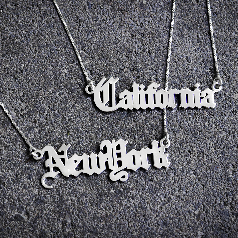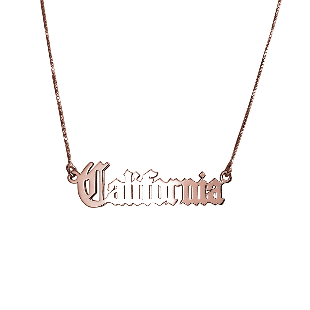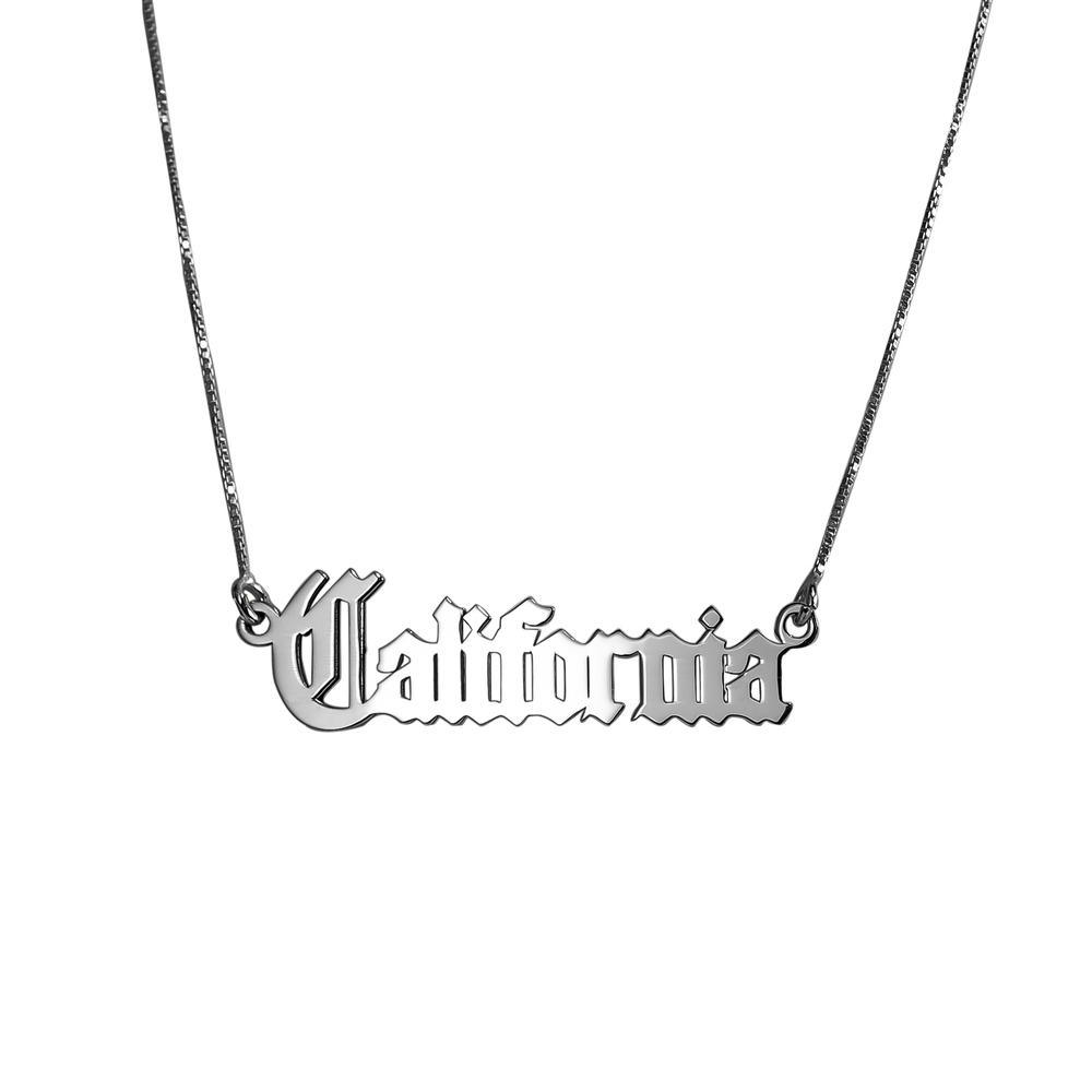 high polishedState Name Nameplate, written in an Old English style font, any state or city is available. It is available in Solid .925 Sterling Silver, 14k Gold Plated, 14k Rose Gold Plated or solid 14k Gold.