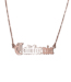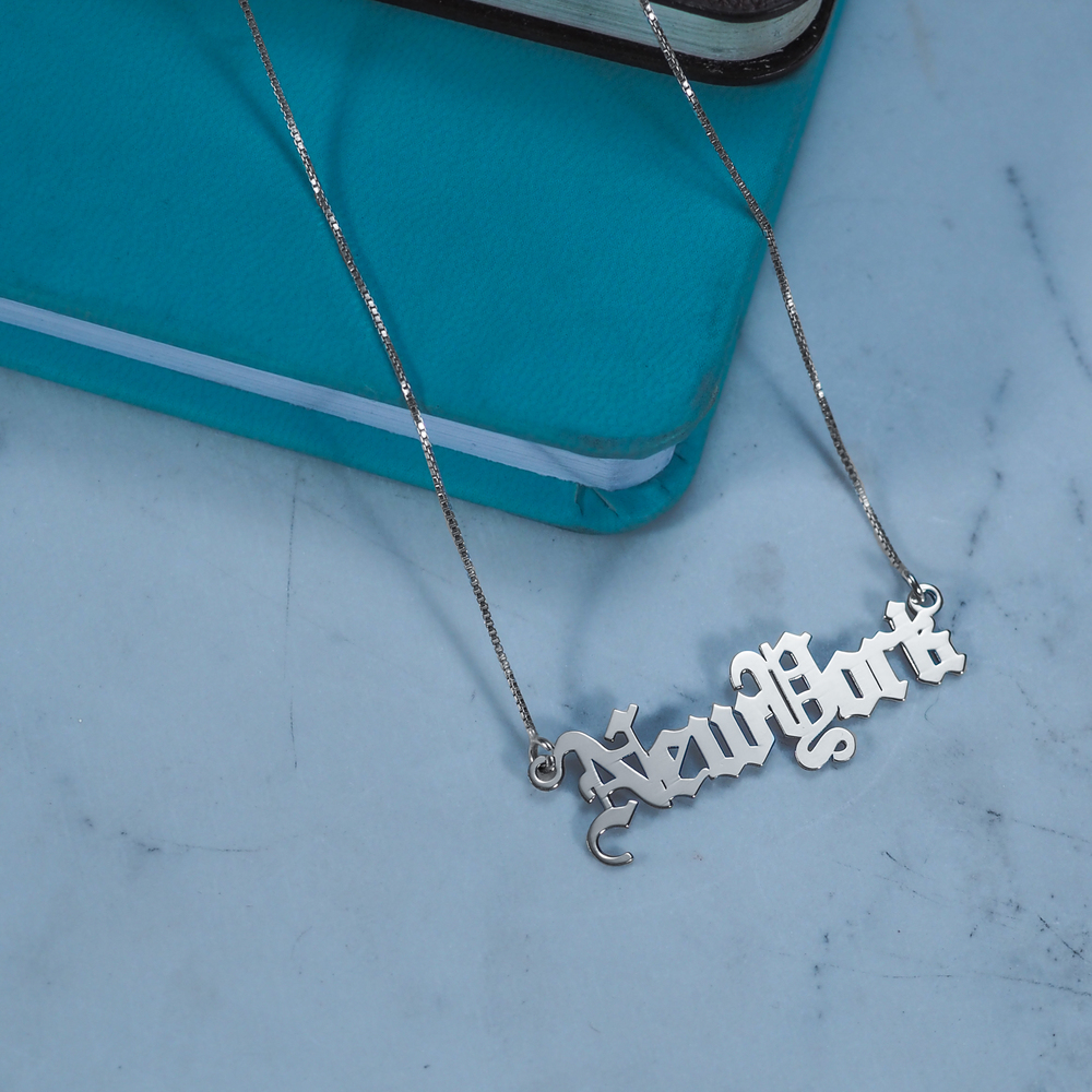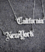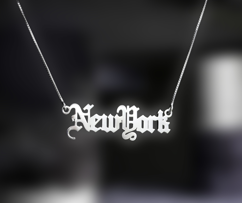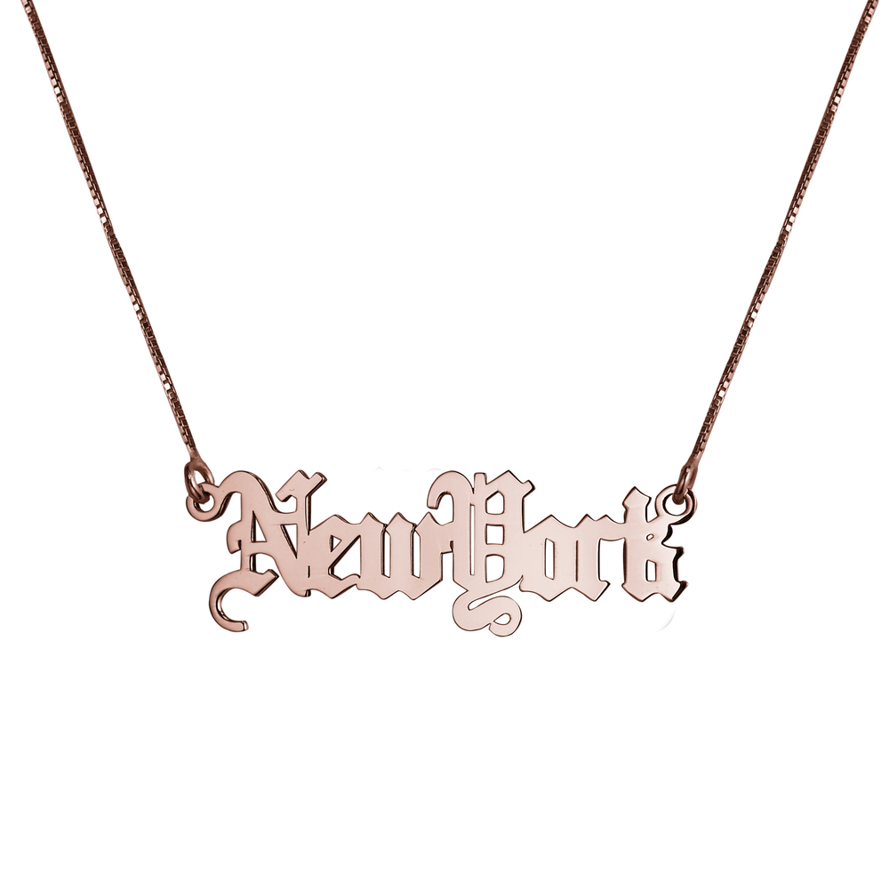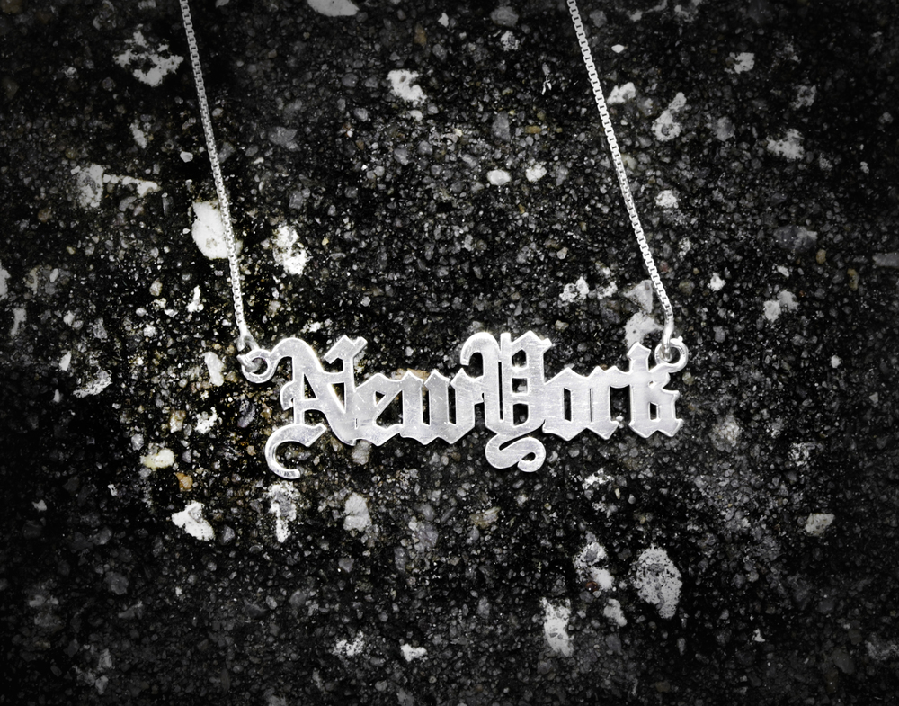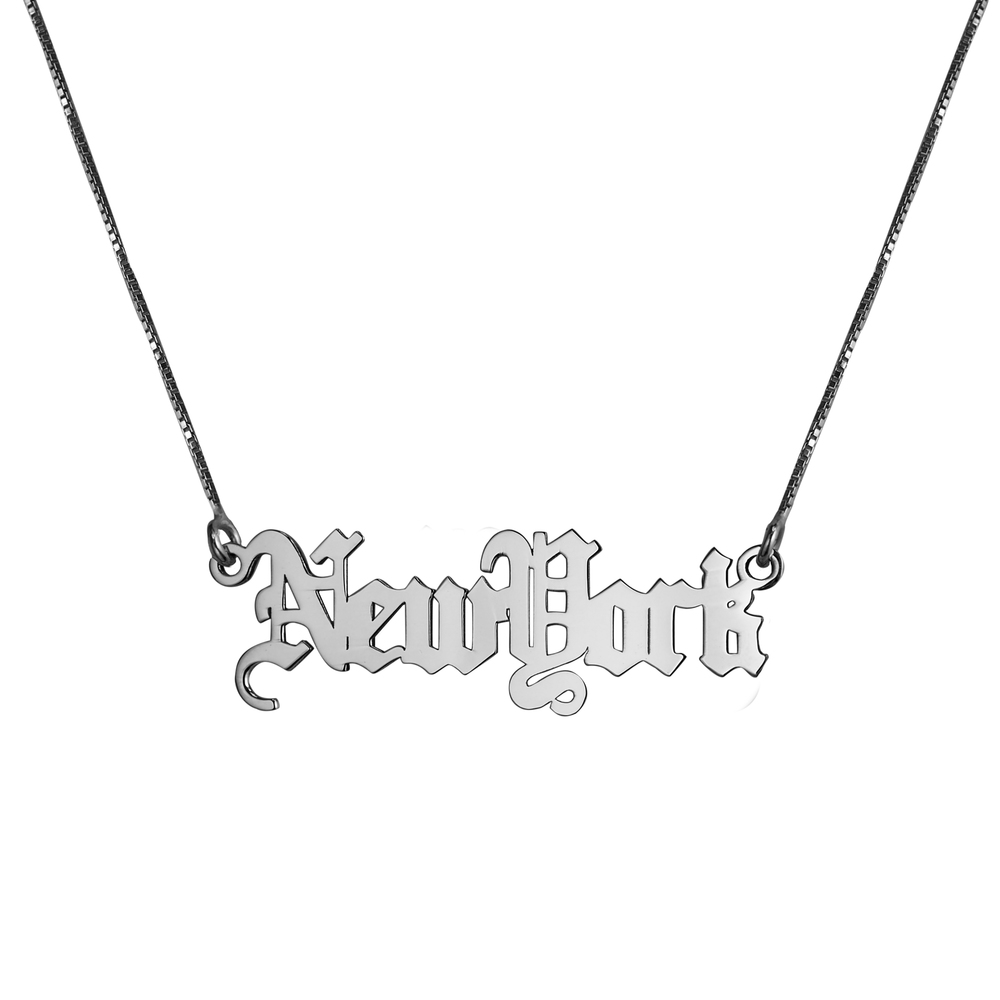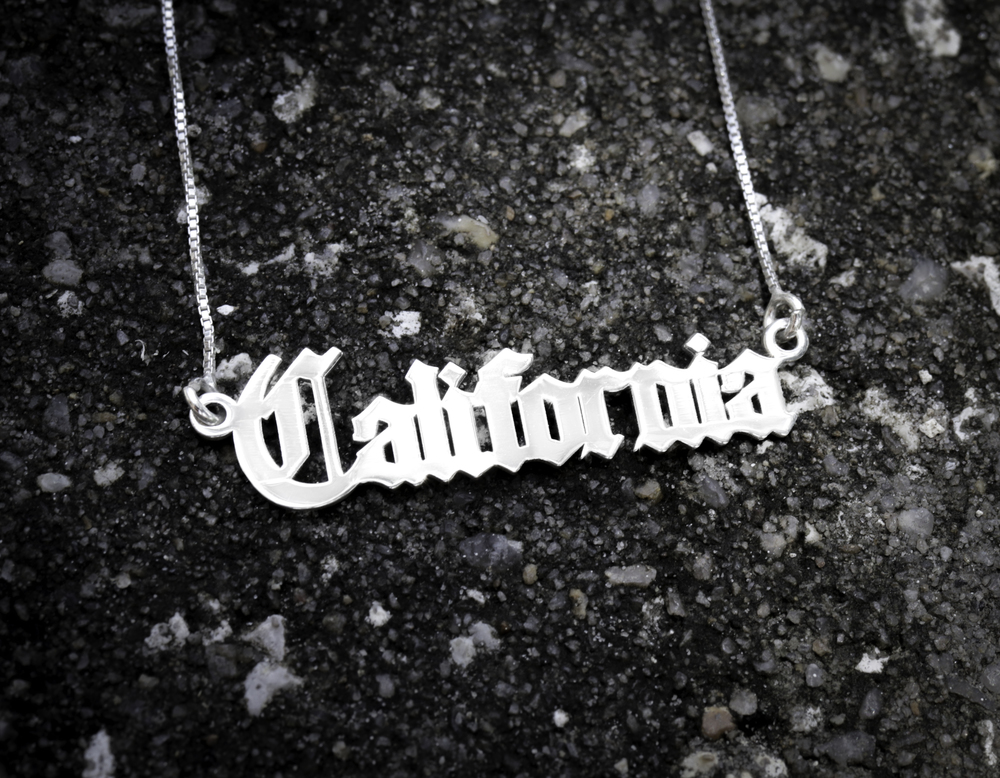 high polishedState Name Nameplate, written in an Old English style font, any state or city is available. It is available in Solid .925 Sterling Silver, 14k Gold Plated, 14k Rose Gold Plated or solid 14k Gold.