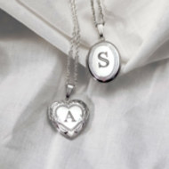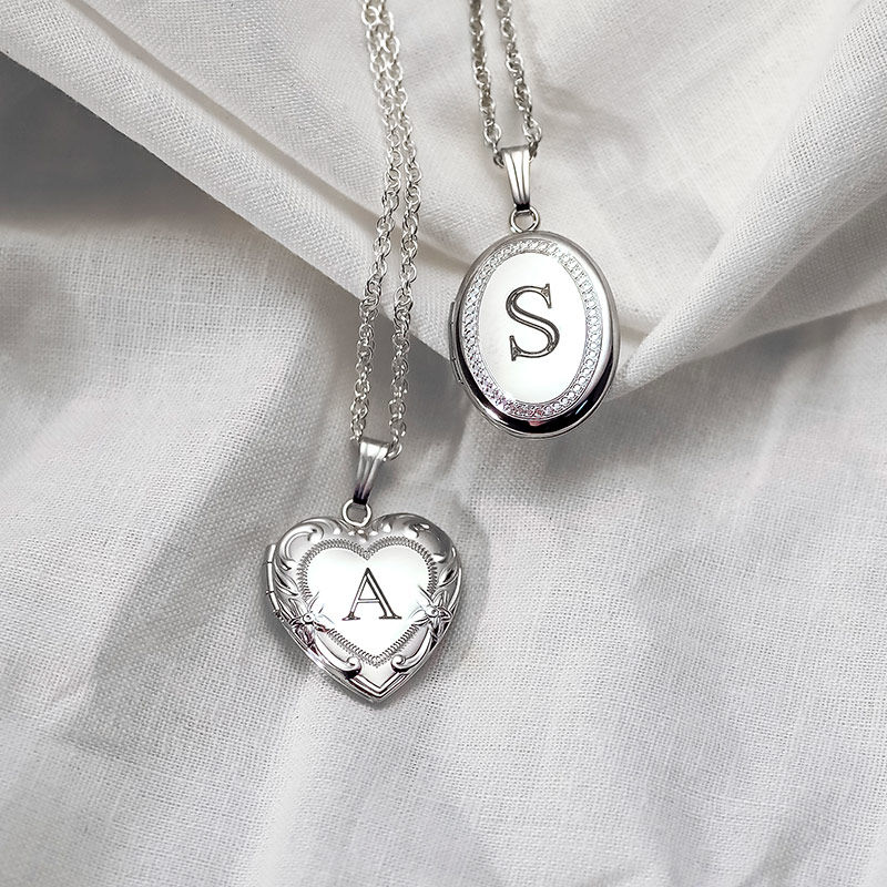 Choose between either a stunning floral beveled heart photo locket or a hand engraved trimmed oval photo locket.