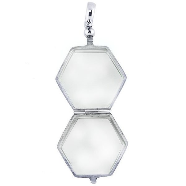 This glass locket features a swiveling bail so you can see the contents from either side! Insert two photos, or display tiny mementos such as a lock of hair or small flower. No two lockets are exactly alike. To open, unscrew the small nut at the top of the locket until the front is released (3-4 turns).
