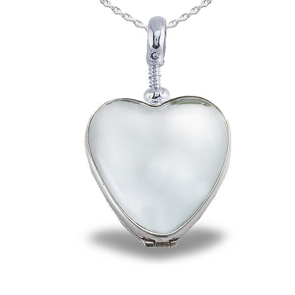 * Perfect for Storing a Lock of Hair * Locket is Glass on Both sides. * Messages can only be Engraved on a plate of Silver inserted inside the locket. * We can also laser a photo on a piece of silver and permanently laser it inside the locket so it is seen through the crystal.