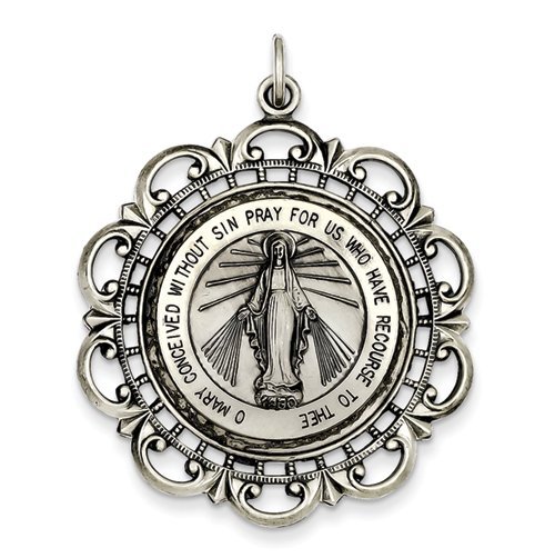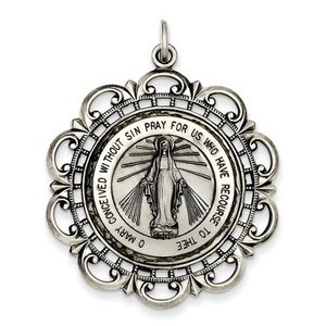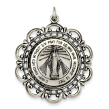 Sterling Silver Miraculous Medal Antiqued Scalloped Round Pendant