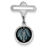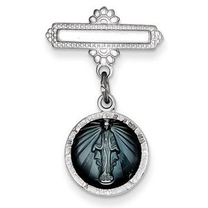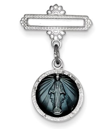 Sterling Silver Miraculous Medal Baptismal Brooch with Aqua Enamel