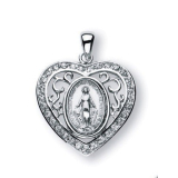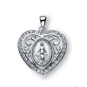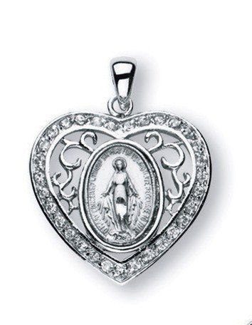 The Traditional Shape Medal is in Heart Shaped Setting with 31 Swarovski Crystal Set Cubic Zircons Embellished Rays of Light around Fancy Border is Adorned with finely detailed Blessed Mother Mary with rays coming out of her extended hands.The Reverse Side of the Medal Portrays an "M" with a Cross on the top and the "Sacred Hearts" underneath surrounded by Twelve Stars. Die striking only the finest grade solid Sterling Silver stock, enables the intricate details of the coined Precious Metal to fully show when the Antique Finish from Hand Polishing is applied to each Medal. It is then highlighted by Hand Engraving, to display the Beautiful Sheen of Pure Sterling
