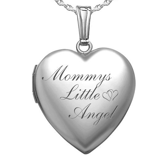 This .925 Solid Sterling Silver Locket has Mommys Little Angell engraved on the center of the front side. It holds 2 photos and can be engraved on the reverse and inside.